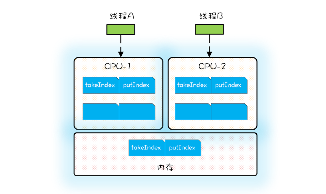 当CPU从内存中加载takeIndex的时候,会同时将putIndex以及count都加载进Cache。下图是某个时刻CPU中Cache的状况,为了简化,缓存行中我们仅列出了takeIndex和putIndex。
