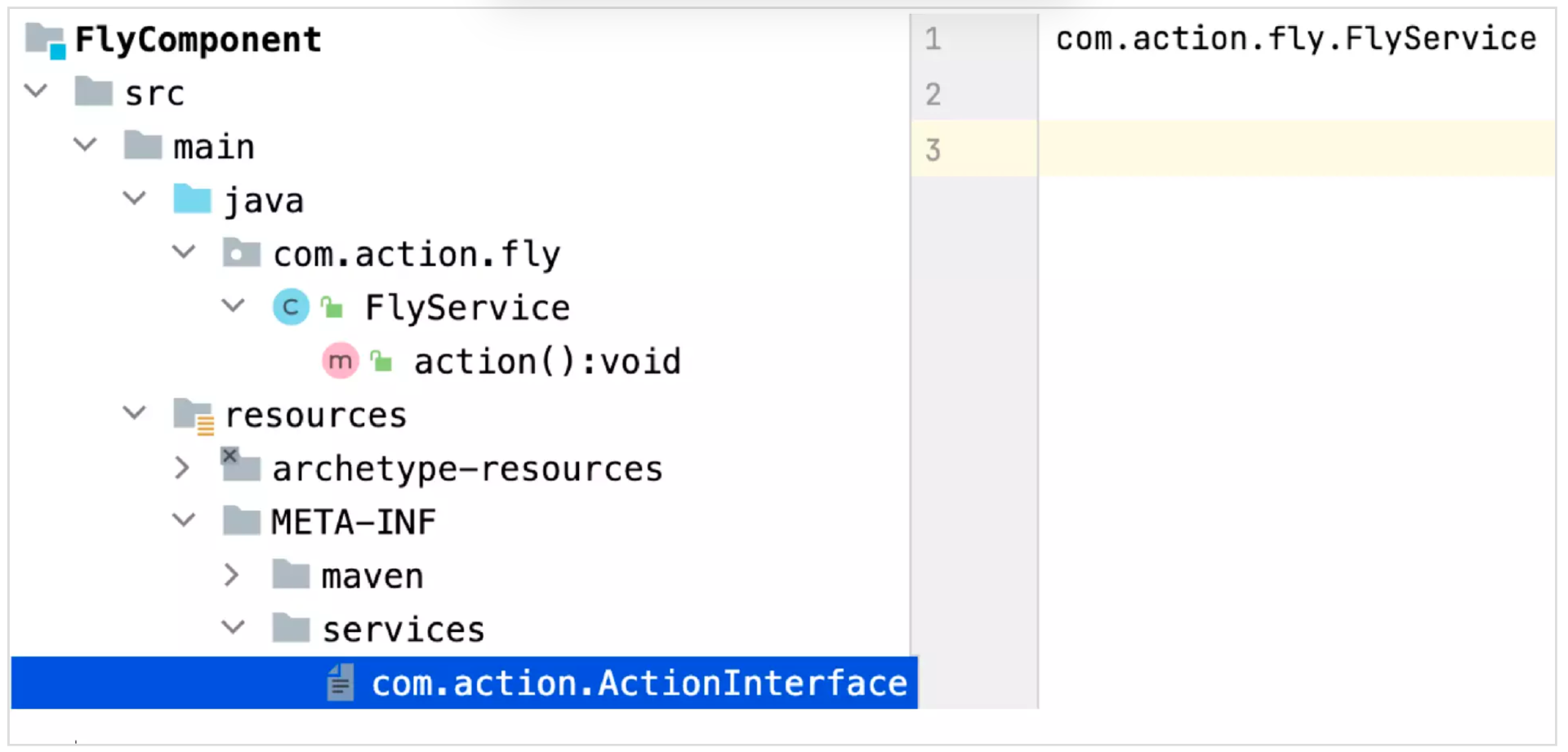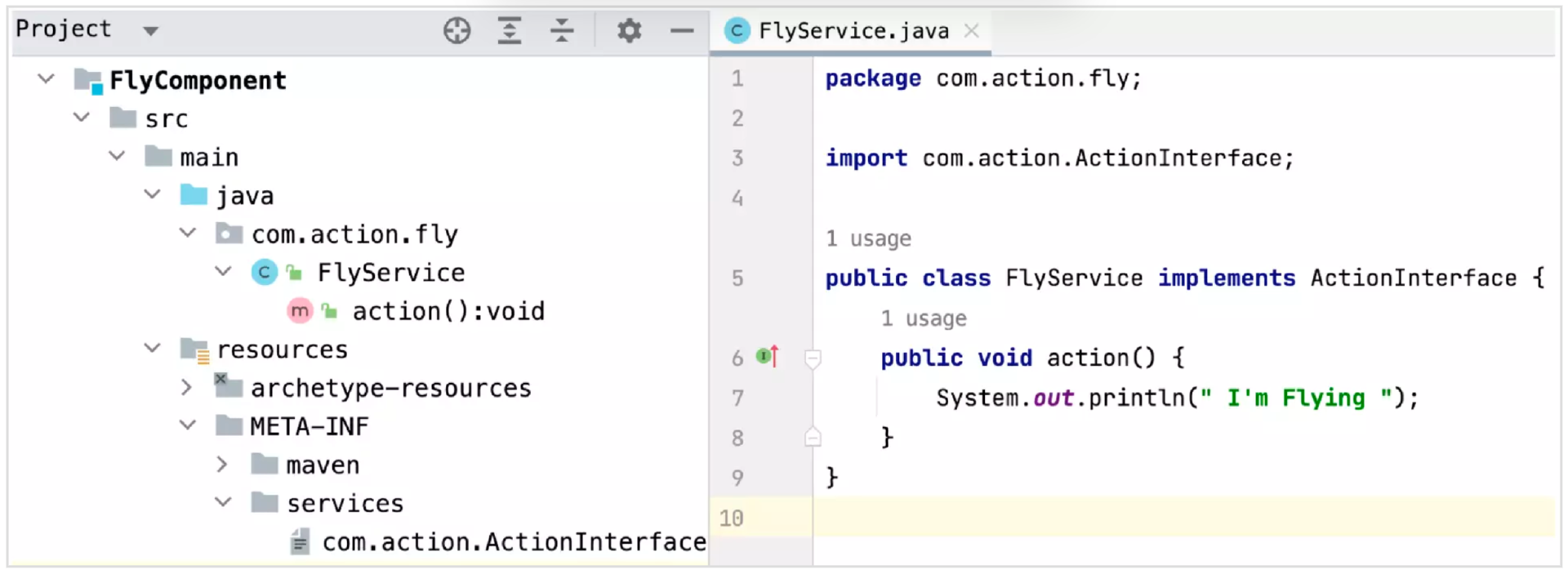 接下来,我们假定有一个开发者A,他准备提供 action() 的解决方案,他也创建一个Maven 工程 FlyComponent,然后实现了ActionInterface接口。