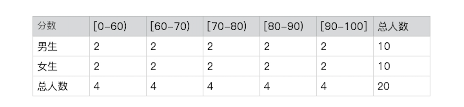 仔细看,这个问题和前面几个有所不同,我只关心男生这个群体,所以解答应该是找到考了90分以上的男生的人数,然后用这个人数除以男生总人数(注意,不再是全部总人数)。根据上述表格的数据来计算,P(90-100|男生)= 2/10=20%。