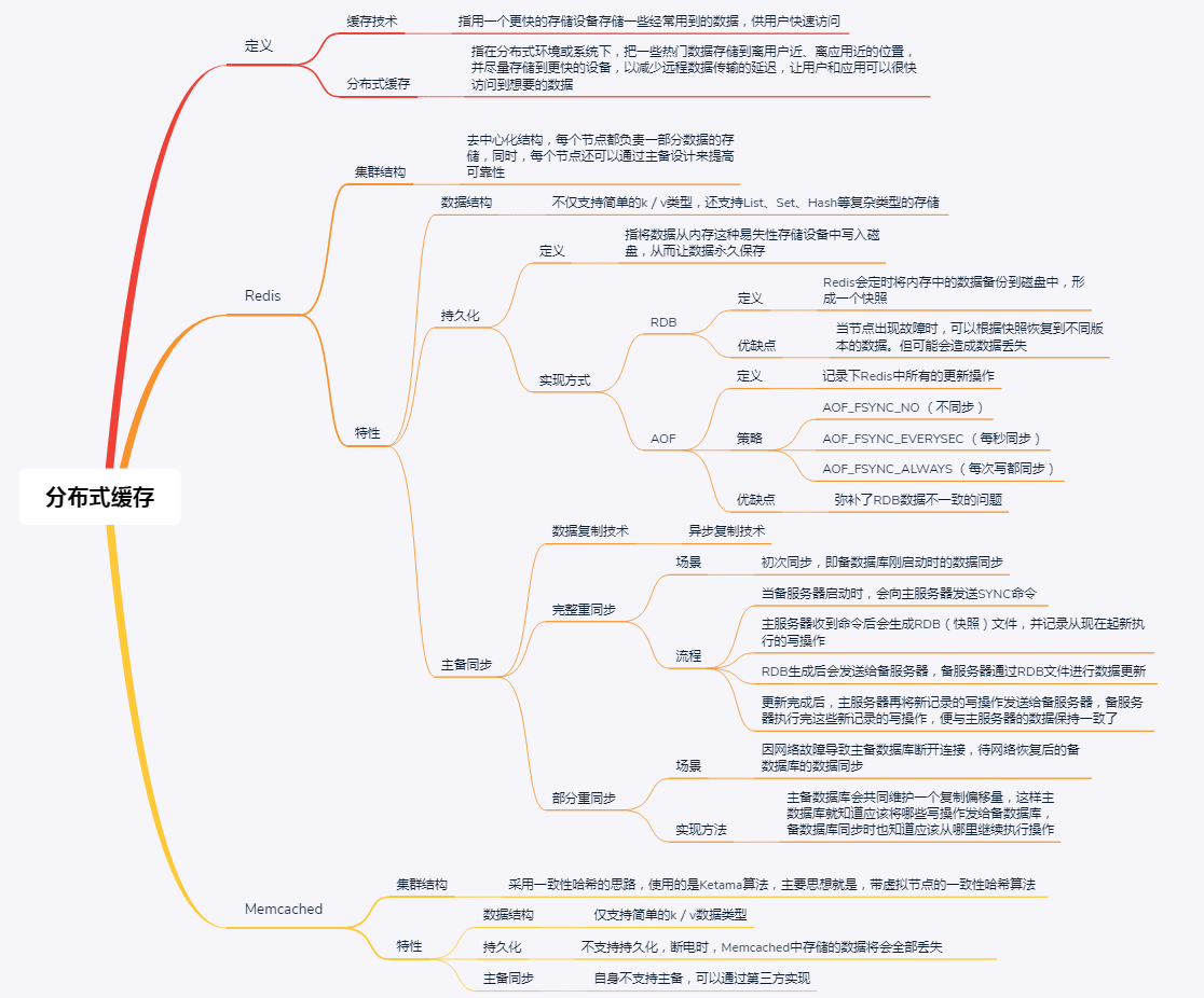 其次,我以主流的Redis和Memcached为例,与你介绍了分布式缓存技术中的关键技术,包括支持的数据存储结构(比如k/v、Set、List等)、持久化技术(包括快照方式等)和数据同步技术(具体技术原理,可参见[第26篇文章])。