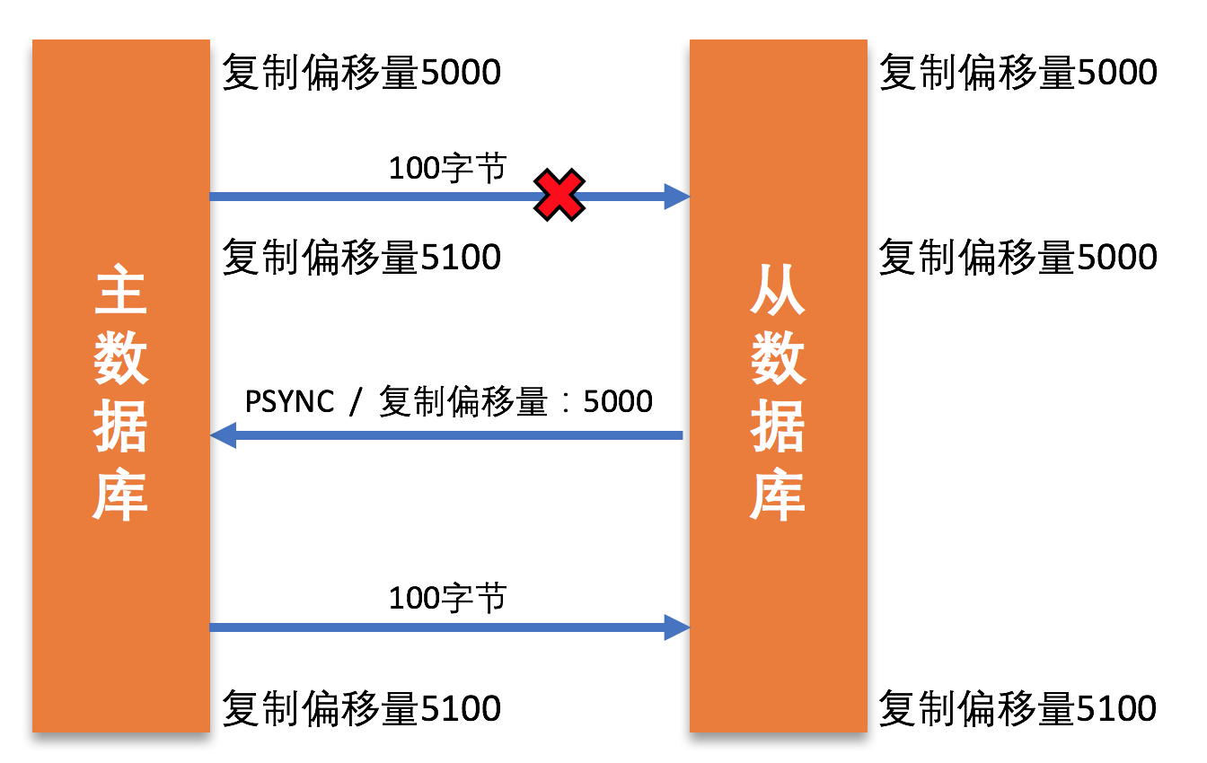 如图所示,主数据库的复制偏移量为5000时,向备数据库发送了100个字节的数据,发送结束后复制偏移量为5100。