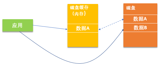 如下图所示,数据A是应用经常访问的数据,而数据B很少被应用访问,因此当应用访问数据A时,不需要到磁盘,而直接访问内存即可得到对应的值,速度较快;相反,访问数据B时,由于内存中没有缓存数据B,所以应用需要到磁盘中获取对应的值,速度较慢。