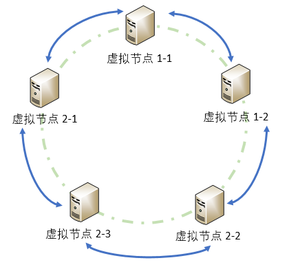 在实际应用中,每个物理节点对应100~200个虚拟节点,才能到达一个较好的存储均衡。这里为了方便理解,我对Memcached的集群结构做了简化,如下图所示,物理节点1对应两个虚拟节点1-1、1-2,物理节点2对应三个虚拟节点2-1、2-2和2-3。