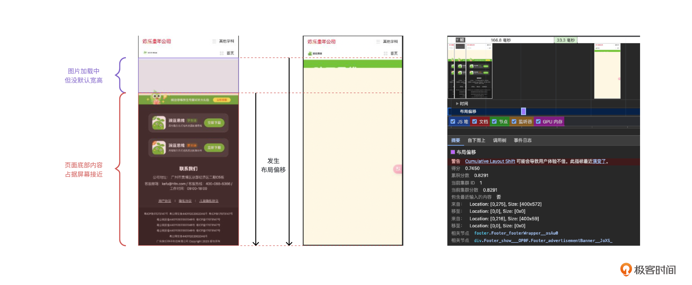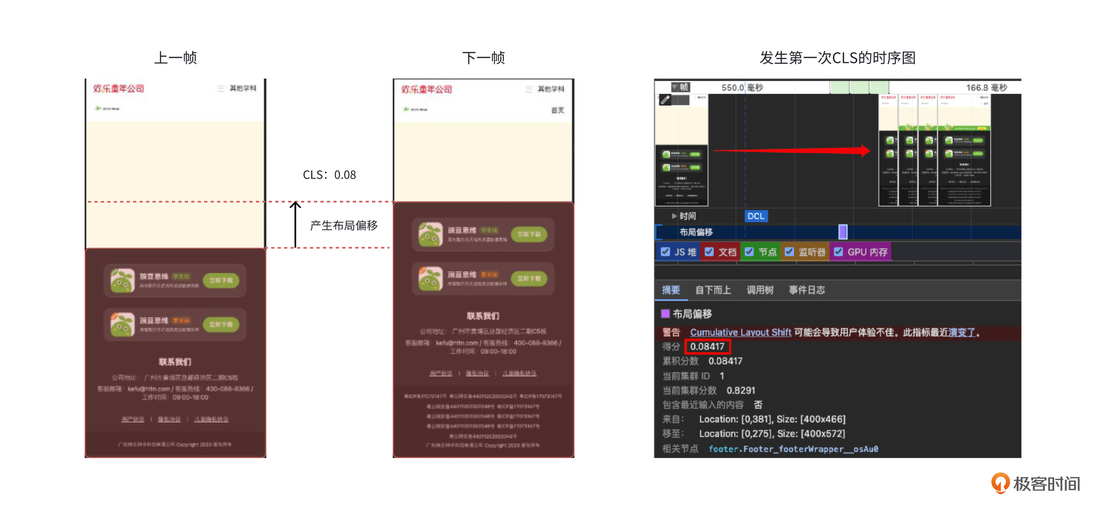 虽然这个分数只是一个参考值,但在实际分析用户体验问题时,我们还需要通过开发者工具进行分析这个值,再下结论。接下来,我们将使用上一节课的例子来进一步解释CLS分数和实际的布局偏移效果。