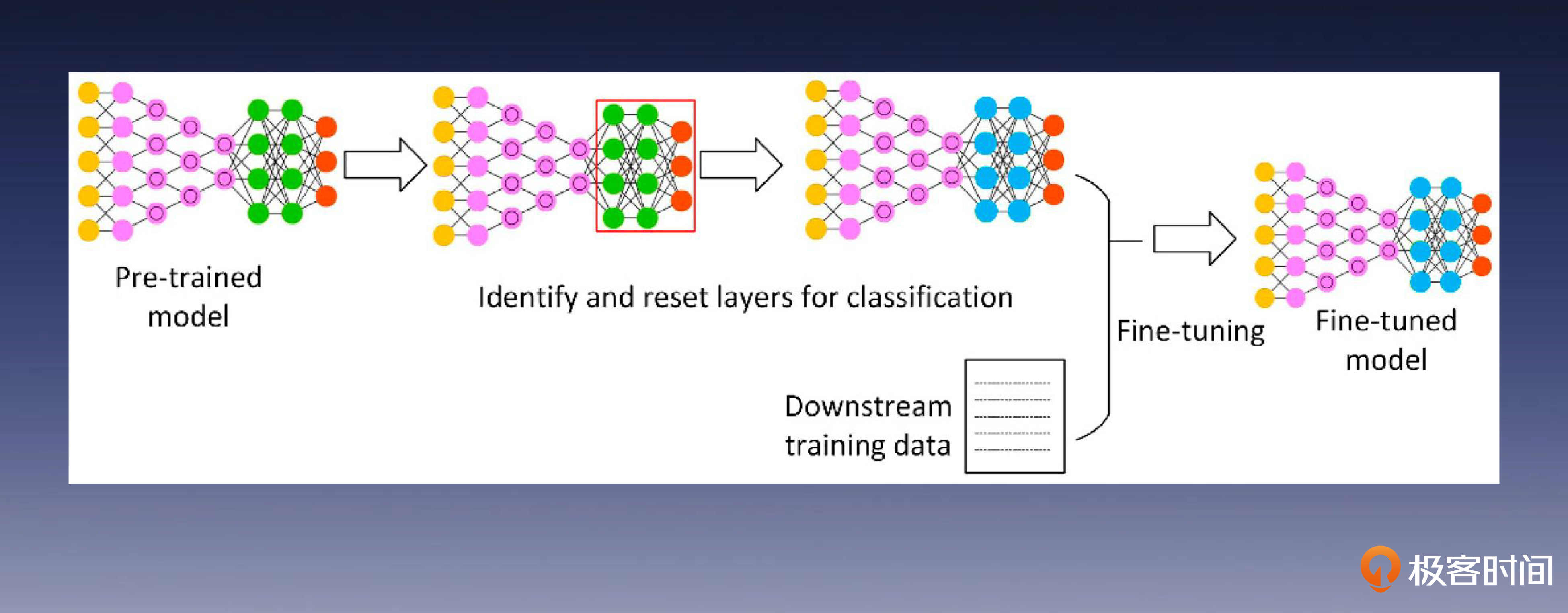 这种分层结构非常适合用来做模型的领域微调,只需要使用较少的数据,更新最上层也就是负责分类功能部分的模型参数,就能够获得良好的效果。