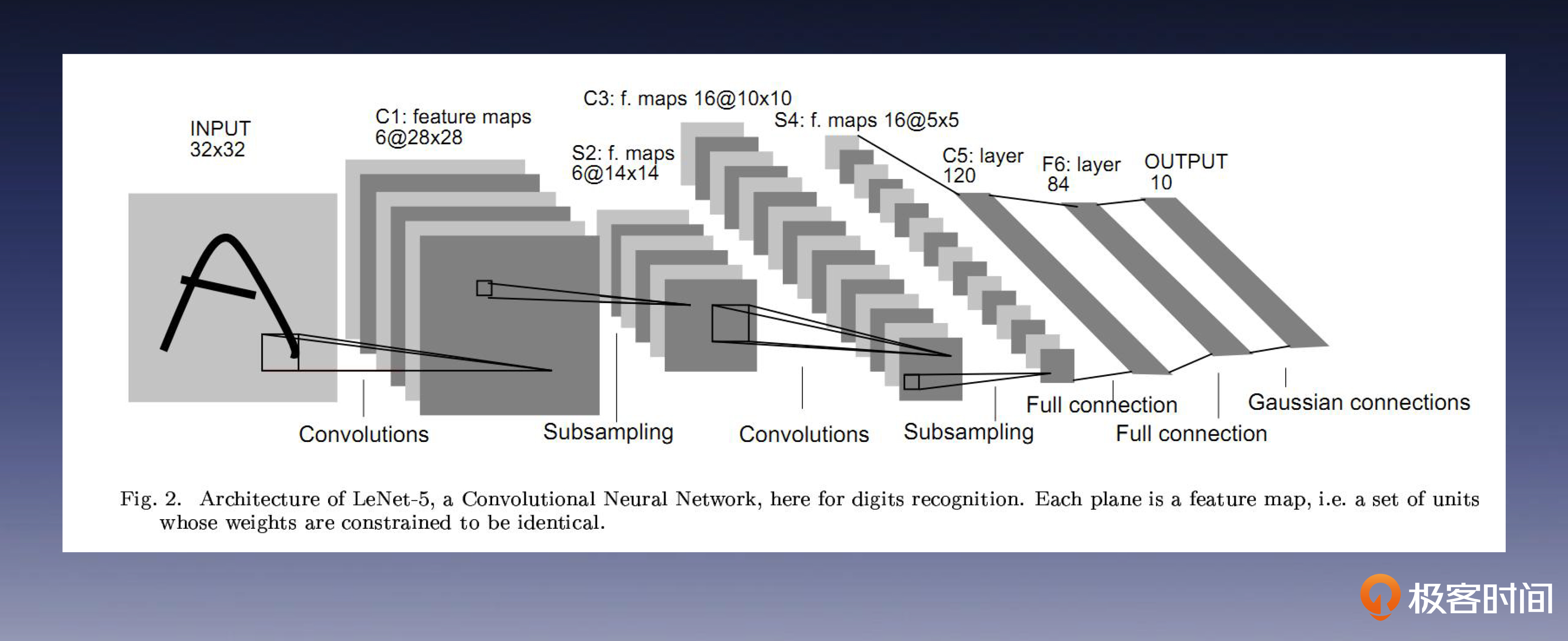 早在 1998 年 LeNet-5 就成功使用下图中的 CNN 网络解决了手写数字识别的任务,并定义了 CNN 的基本结构。然而,由于当时训练 CNN 所需的计算资源非常庞大,学术界和产业界都没有进一步研究它的想法,只是把它看成实验室中的一种“玩具”封存了起来。