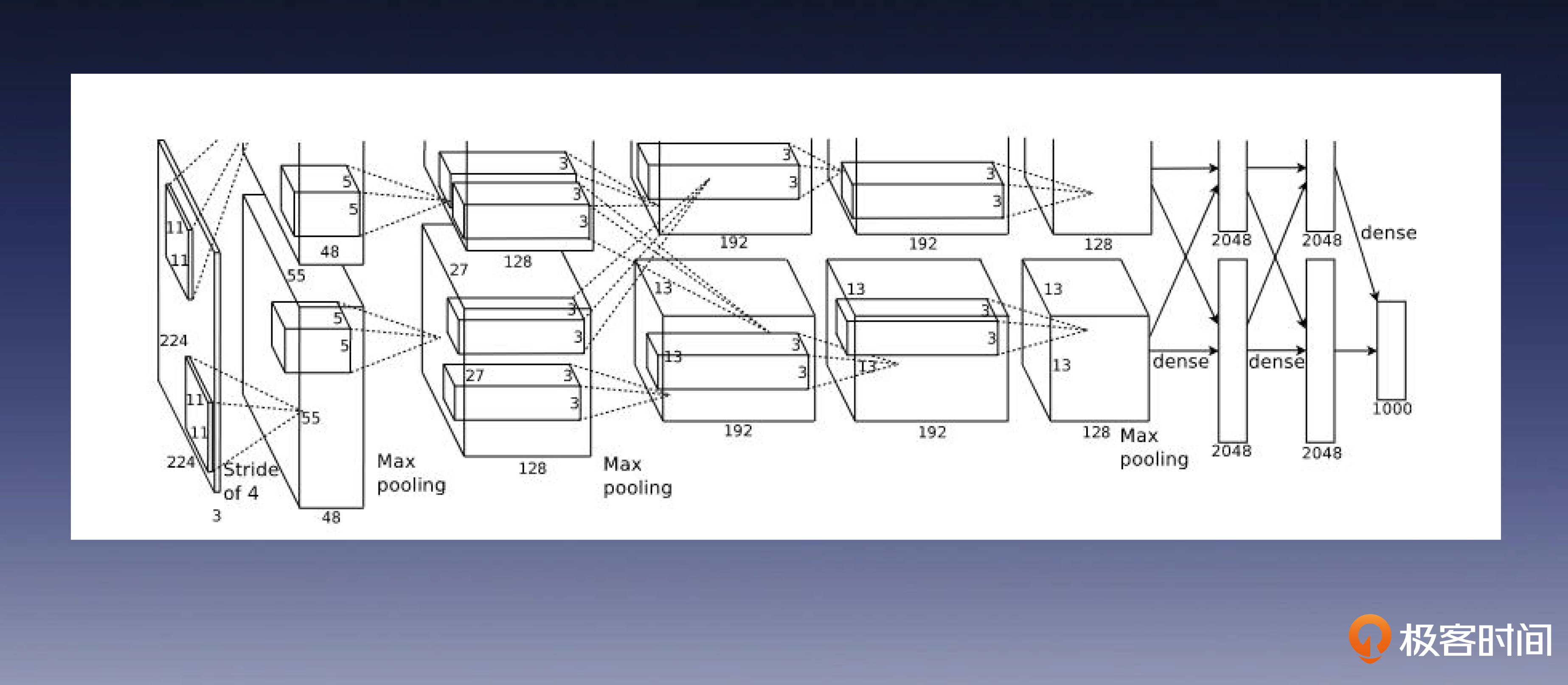 直到 2012 年,Hinton 教授的团队终于通过利用一些沿用至今的训练技巧(包括 ReLU 激活函数、Dropout 正则化和数据增强)以及两块 GTX 580 GPU,让下图中 CNN 架构的 AlexNet 取得了突破性的成果,在 ImageNet 竞赛中一举夺冠。