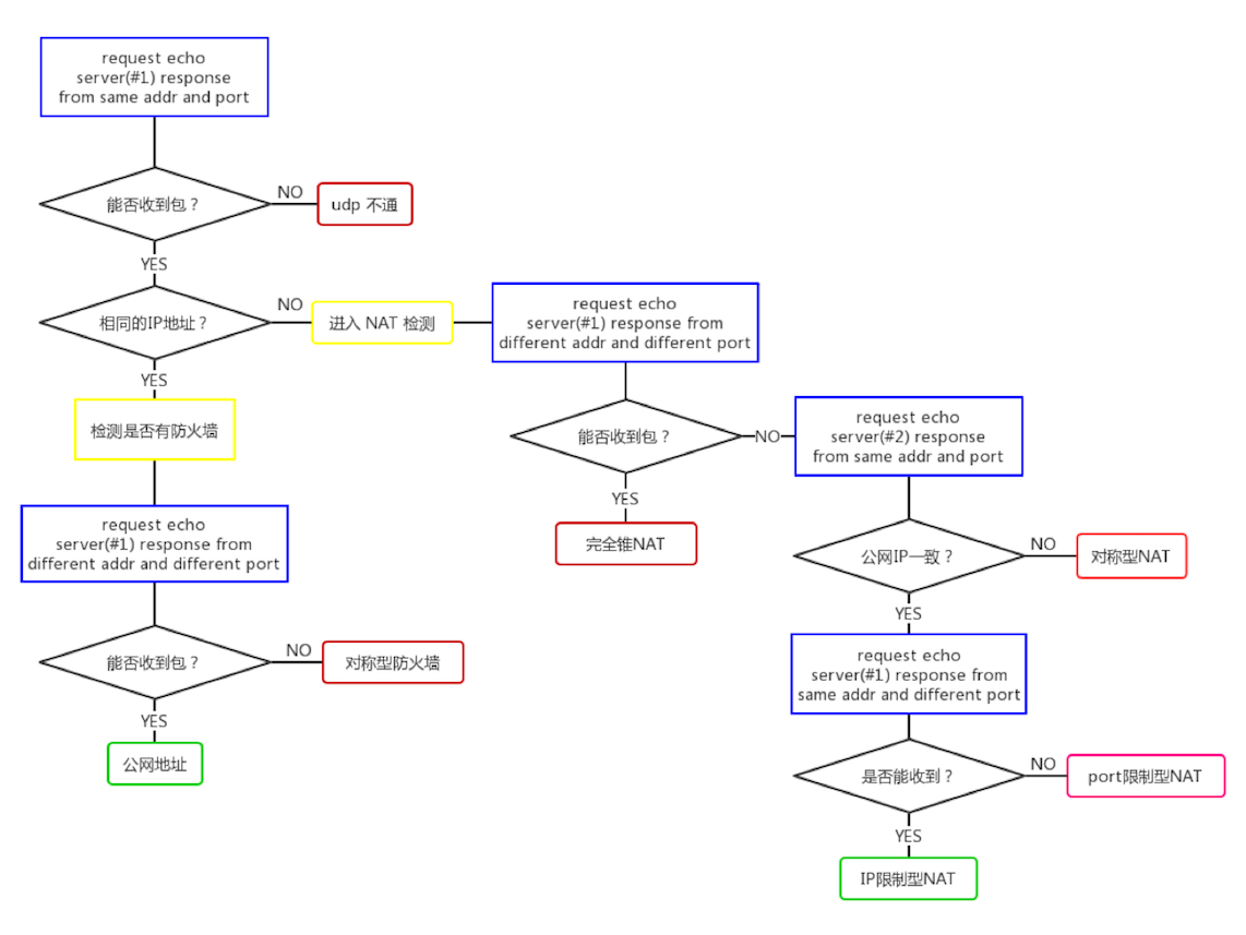 上面这张图清楚地表达了主机进行 NAT 类型检测的流程。其中蓝框是几个重要的检测点,通过这几个检测点你就可以很容易地检测出上面介绍的4种不同类型的 NAT了。