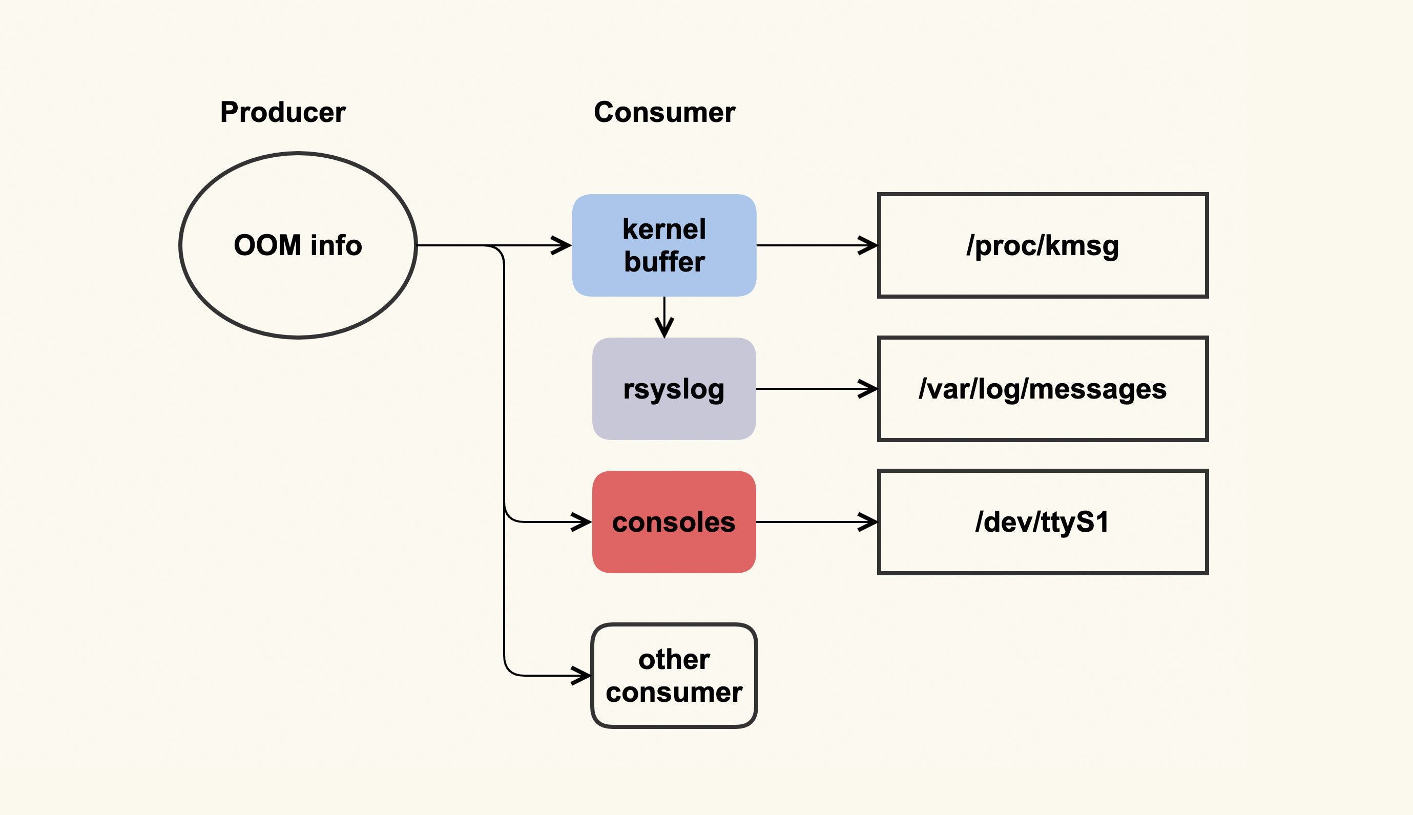 这个单生产者多消费者模型,其实是由OOM killer打印日志(OOM info)时所使用的printk(类似于userspace的printf)机制来决定的。printk会检查这些日志需要输出给哪些消费者,比如写入到内核缓冲区(kernel buffer),然后通过dmesg命令来查看;我们通常也都会配置rsyslog,然后rsyslogd会将内核缓冲区的内容给转储到日志文件(/var/log/messages)中;服务器也可能会连着一些控制台(console ),比如串口,这些日志也会输出到这些console。