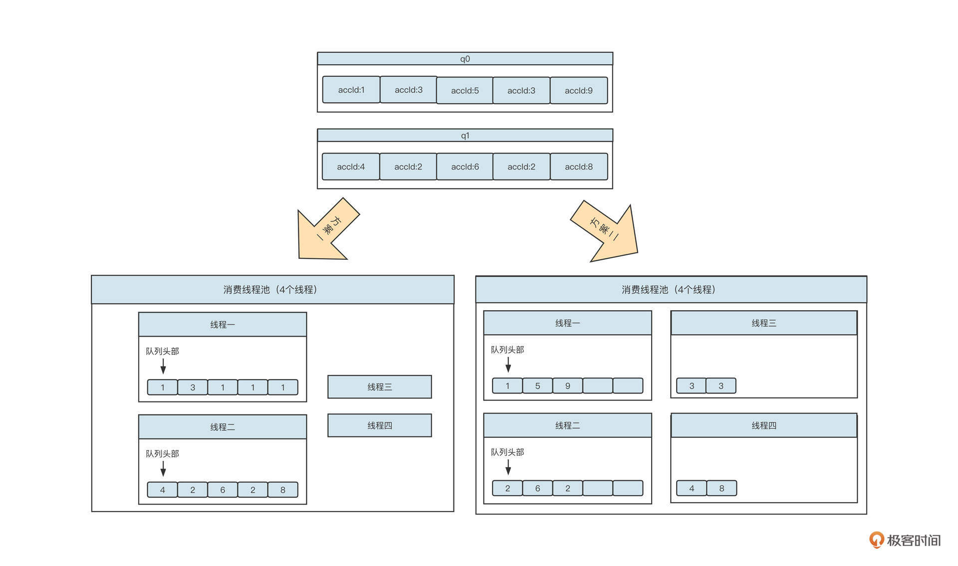 创建消费线程池部分是我们这个方案的点睛之笔,它对应的是第三小节顺序消费改进模型图中用虚线勾画出的线程池。为了方便你回顾,我把这个图粘贴在下面。