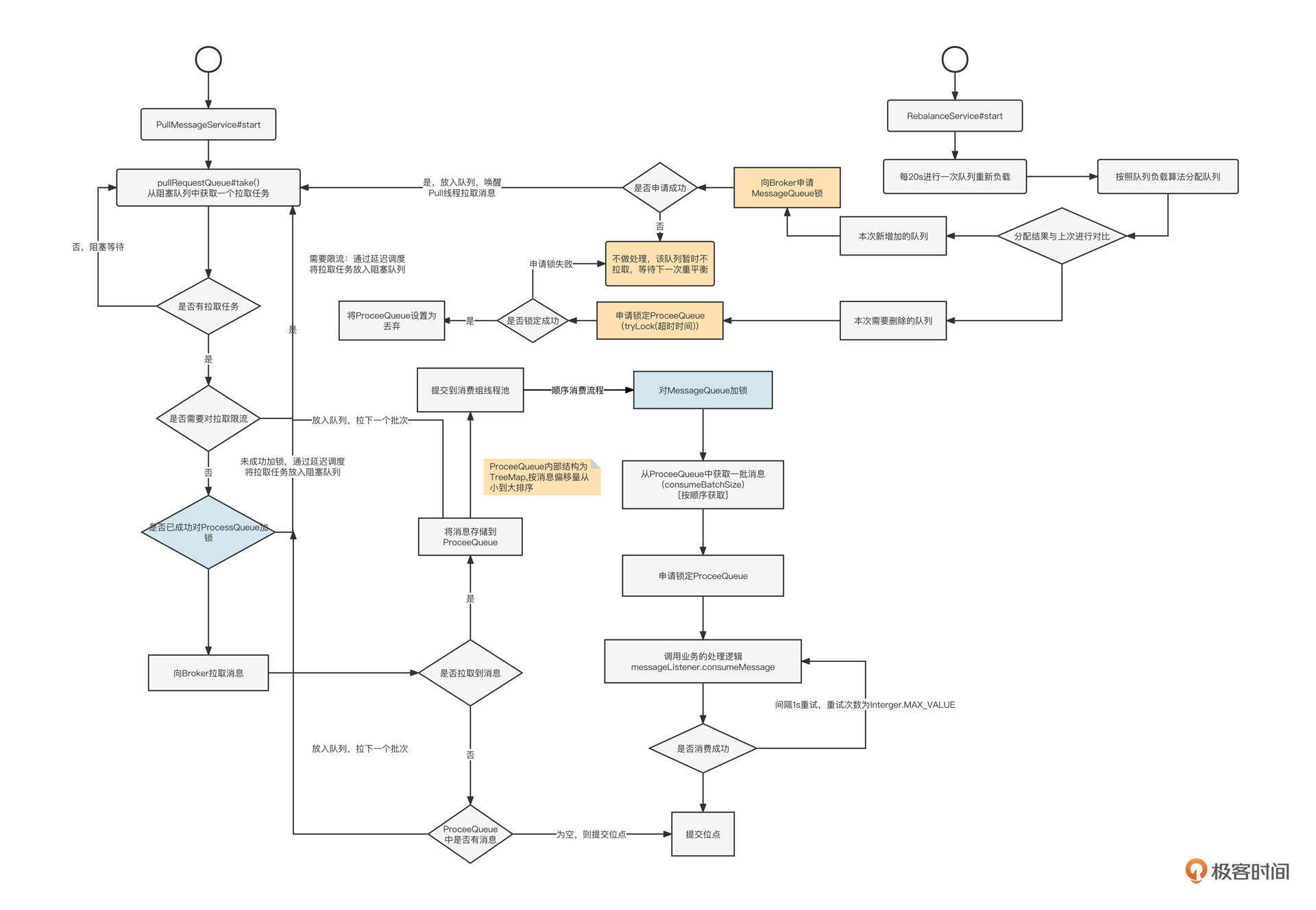 RocketMQ一次只会拉取一个队列中的消息,然后将其提交到线程池。为了保证顺序消费,RocketMQ在消费过程中有下面几个关键点: