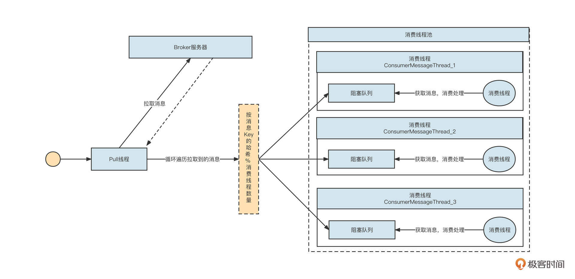 - 调用DefaultMQLitePushConsumer的start方法后,会依次启动Pull线程(消息拉取线程)、消费组线程池、消息处理队列与消费处理任务。这里的重点是,一个AbstractConsumerTask代表一个消费线程,一个AbstractConsumerTask关联一个任务队列,消息在按照Key路由后会放入指定的任务队列,从而被指定线程处理。