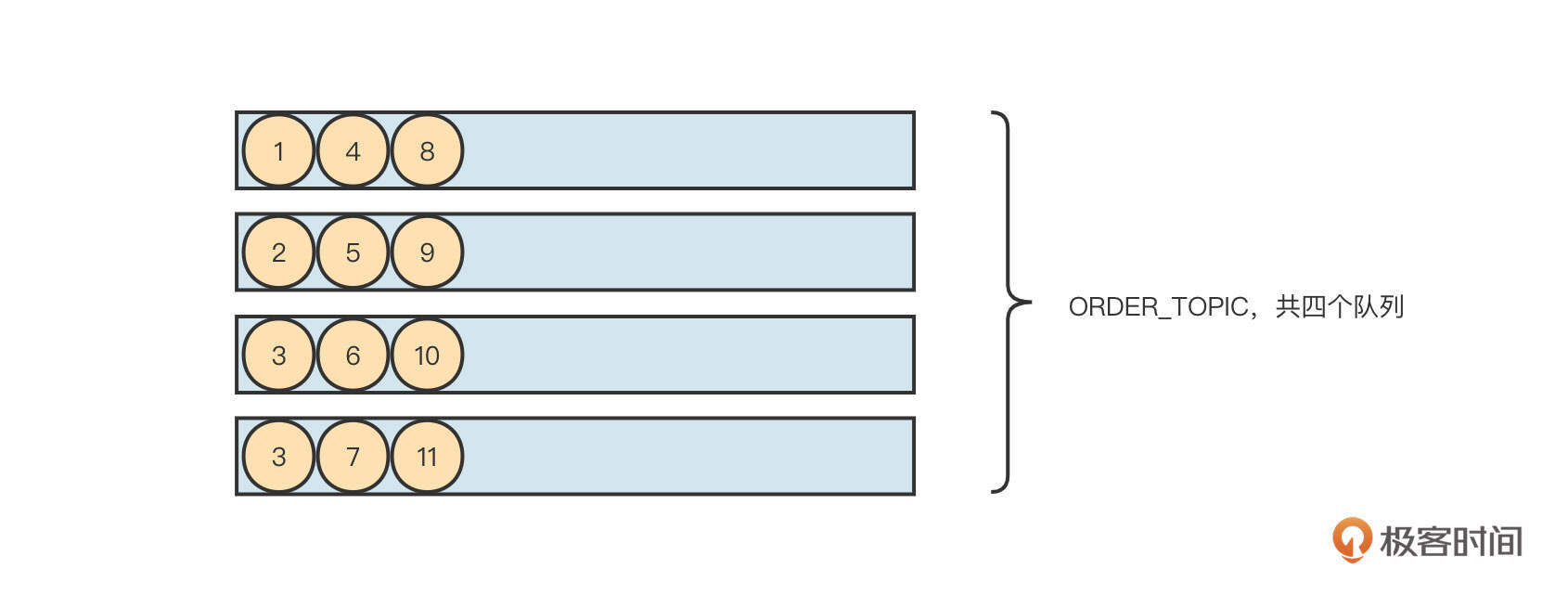 我们先来了解一下 RocketMQ 顺序消费的实现原理。RocketMQ支持局部顺序消息消费,可以保证同一个消费队列上的消息顺序消费。例如,消息发送者向主题为ORDER_TOPIC的4个队列共发送12条消息, RocketMQ 可以保证1、4、8这三条按顺序消费,但无法保证消息4和消息2的先后顺序。