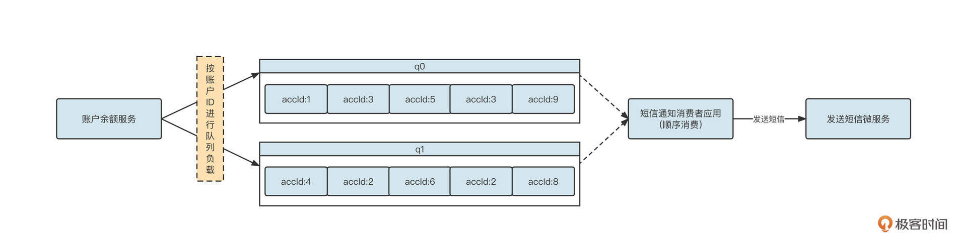q0队列中依次发送了账号ID为1、3、5、3、9的5条消息,这些消息将严格按照顺序执行。但是,我们为账号1和账号3发送余额变更短信,时间顺序必须和实际的时间顺序保持一致吗?
