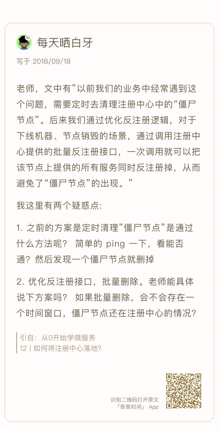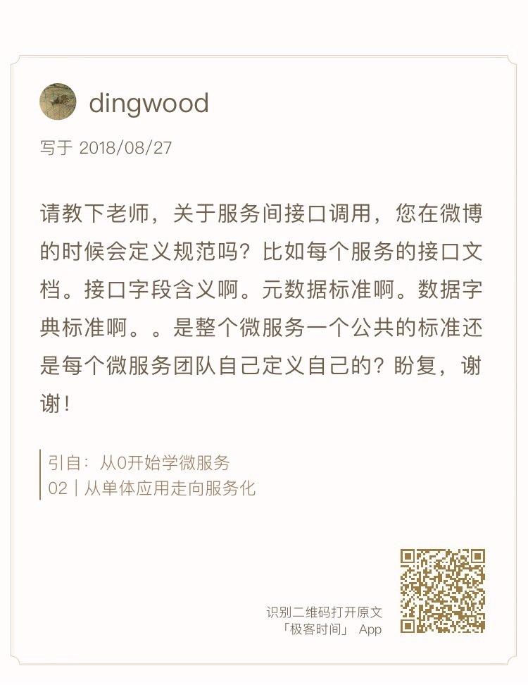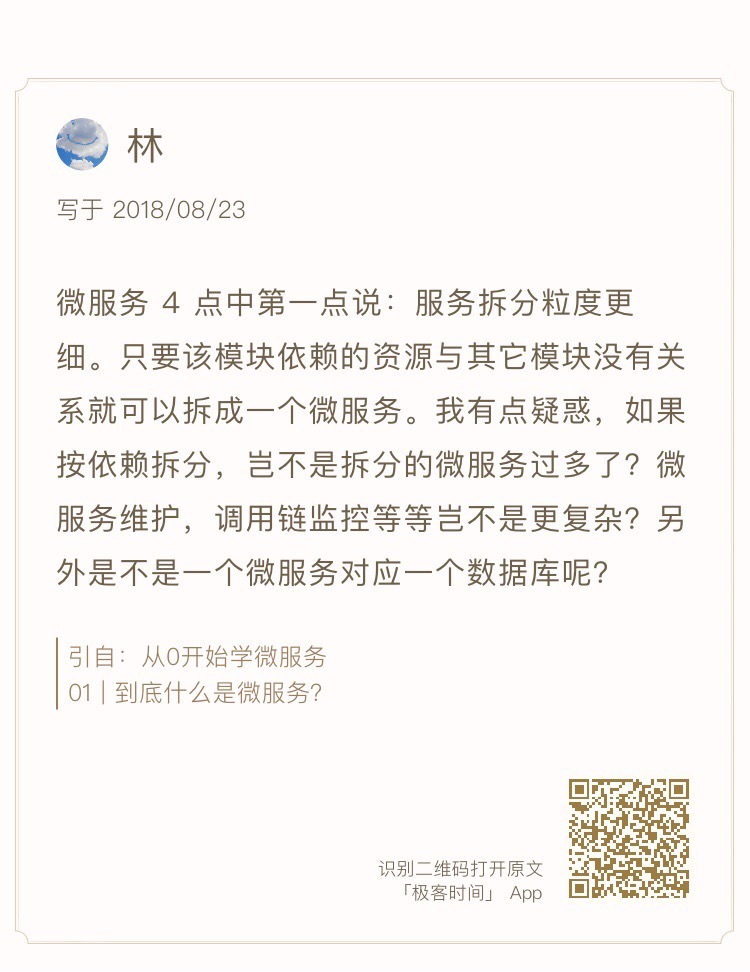 今天的答疑就到这里啦,欢迎你在留言区写下自己学习、实践微服务的心得和体会,与我和其他同学一起讨论。你也可以点击“请朋友读”,把今天的内容分享给好友,或许这篇文章可以帮到他。