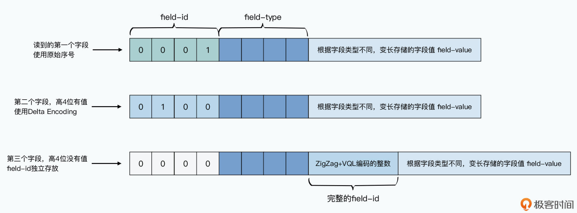 顾名思义,TCompactProtocol就是一种“紧凑”的编码方式。Thrift的IDL都是从1开始编号的,而且通常两个字段的编号是连续的。所以这个协议在存储编号的时候,存储的不是编号的值,而是存储编号和上一个编号的差。