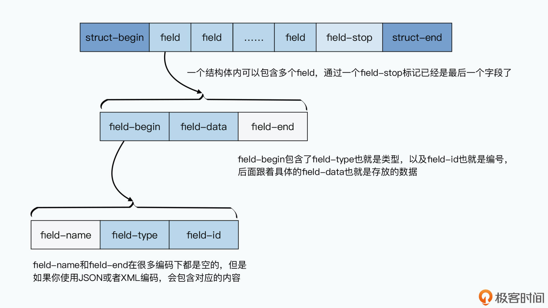 而Thrift里的TBinaryProtocol的实现方式也很简单,那就是顺序写入数据的过程中,不仅会写入数据的值(field-value),还会写入数据的编号(field-id)和类型(field-type);读取的时候也一样。并且,在每一条记录的结束都会写下一个标志位。