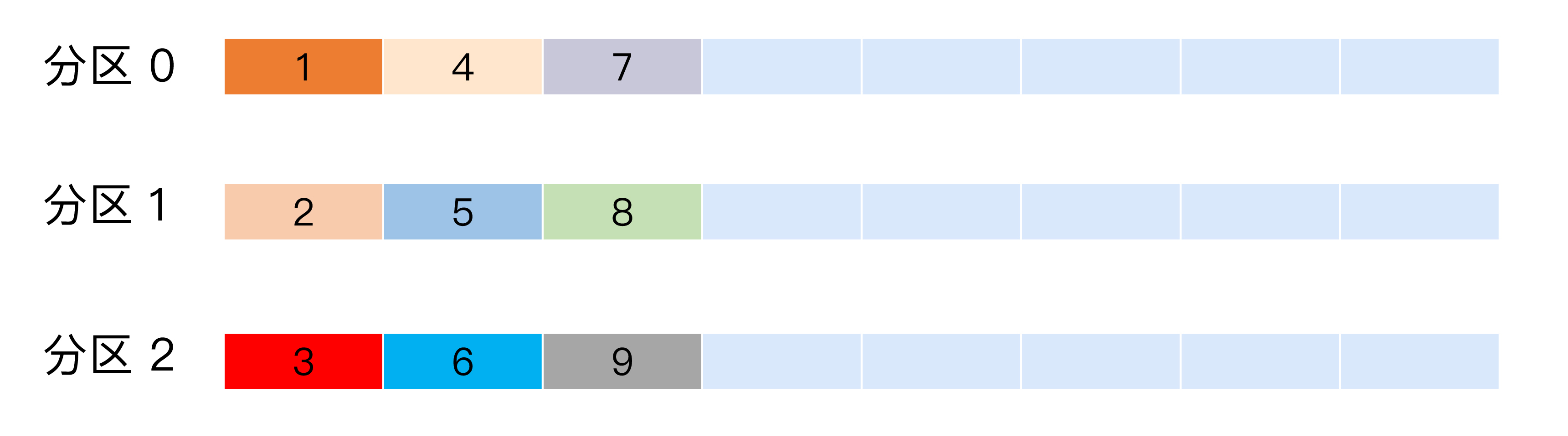 也称Round-robin策略,即顺序分配。比如一个主题下有3个分区,那么第一条消息被发送到分区0,第二条被发送到分区1,第三条被发送到分区2,以此类推。当生产第4条消息时又会重新开始,即将其分配到分区0,就像下面这张图展示的那样。