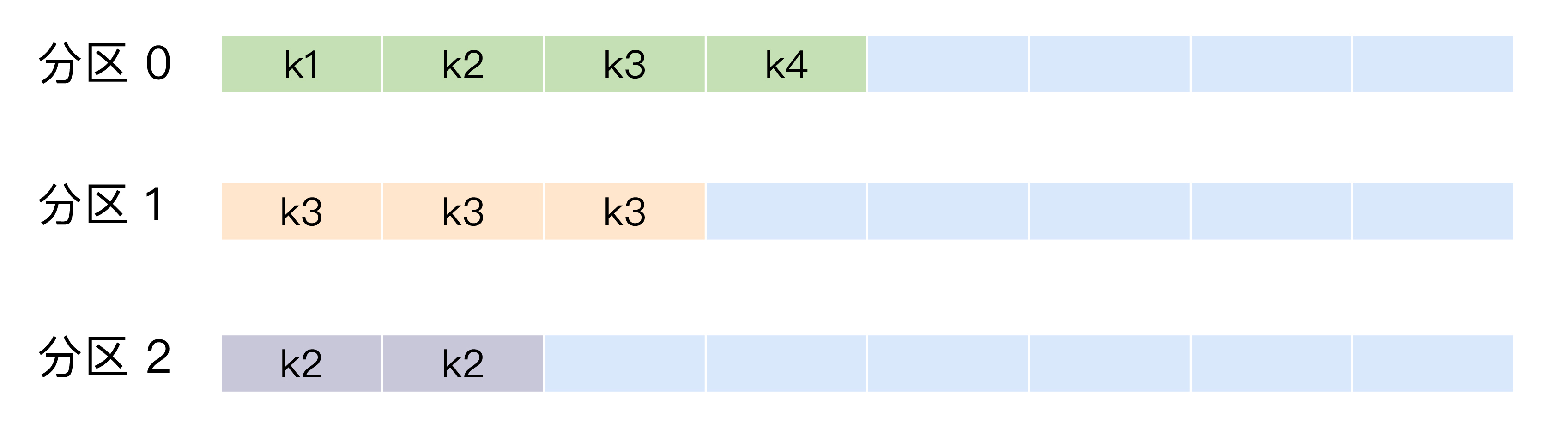 Kafka允许为每条消息定义消息键,简称为Key。这个Key的作用非常大,它可以是一个有着明确业务含义的字符串,比如客户代码、部门编号或是业务ID等;也可以用来表征消息元数据。特别是在Kafka不支持时间戳的年代,在一些场景中,工程师们都是直接将消息创建时间封装进Key里面的。一旦消息被定义了Key,那么你就可以保证同一个Key的所有消息都进入到相同的分区里面,由于每个分区下的消息处理都是有顺序的,故这个策略被称为按消息键保序策略,如下图所示。