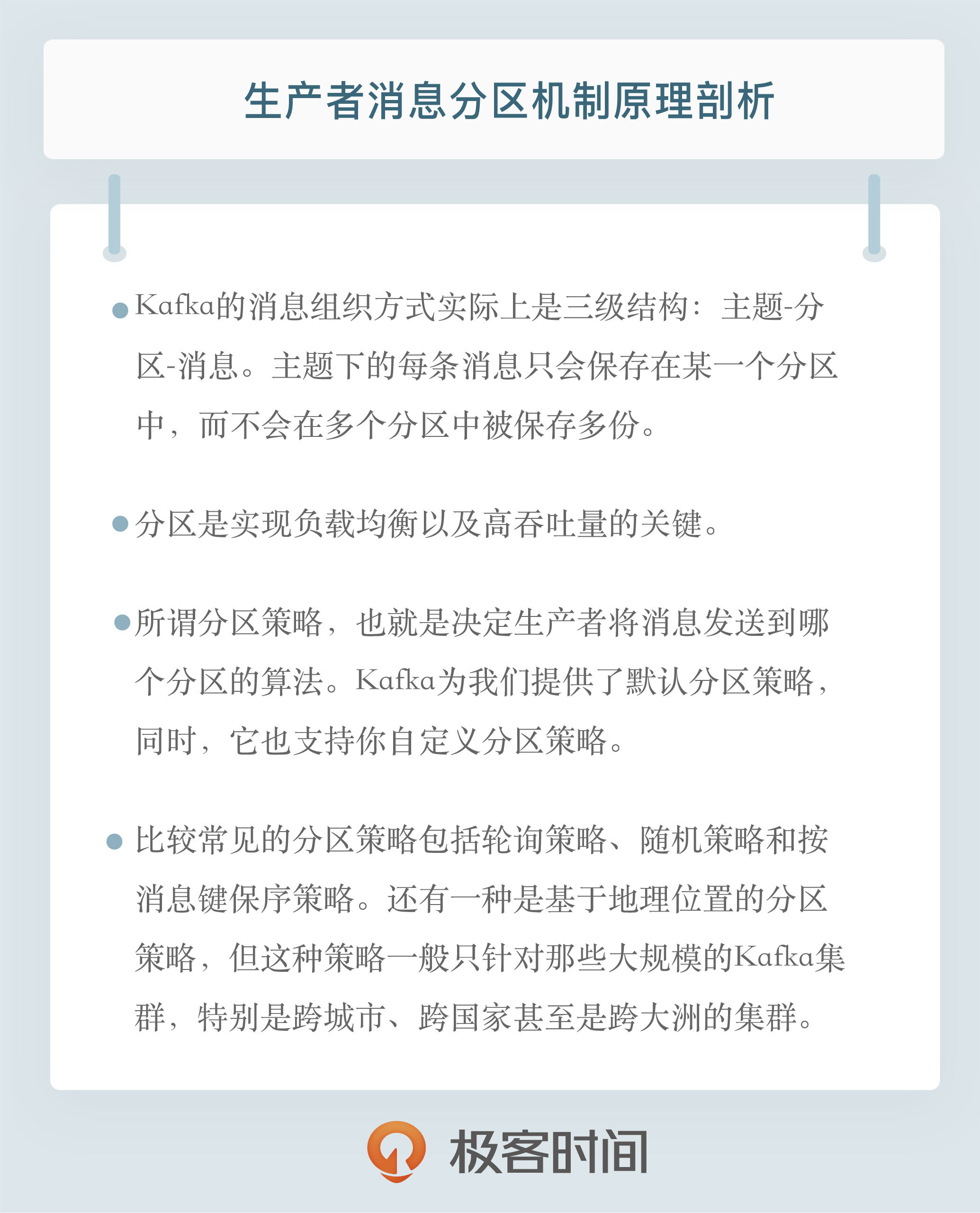 上面这几种分区策略都是比较基础的策略,除此之外你还能想到哪些有实际用途的分区策略?其实还有一种比较常见的,即所谓的基于地理位置的分区策略。当然这种策略一般只针对那些大规模的Kafka集群,特别是跨城市、跨国家甚至是跨大洲的集群。