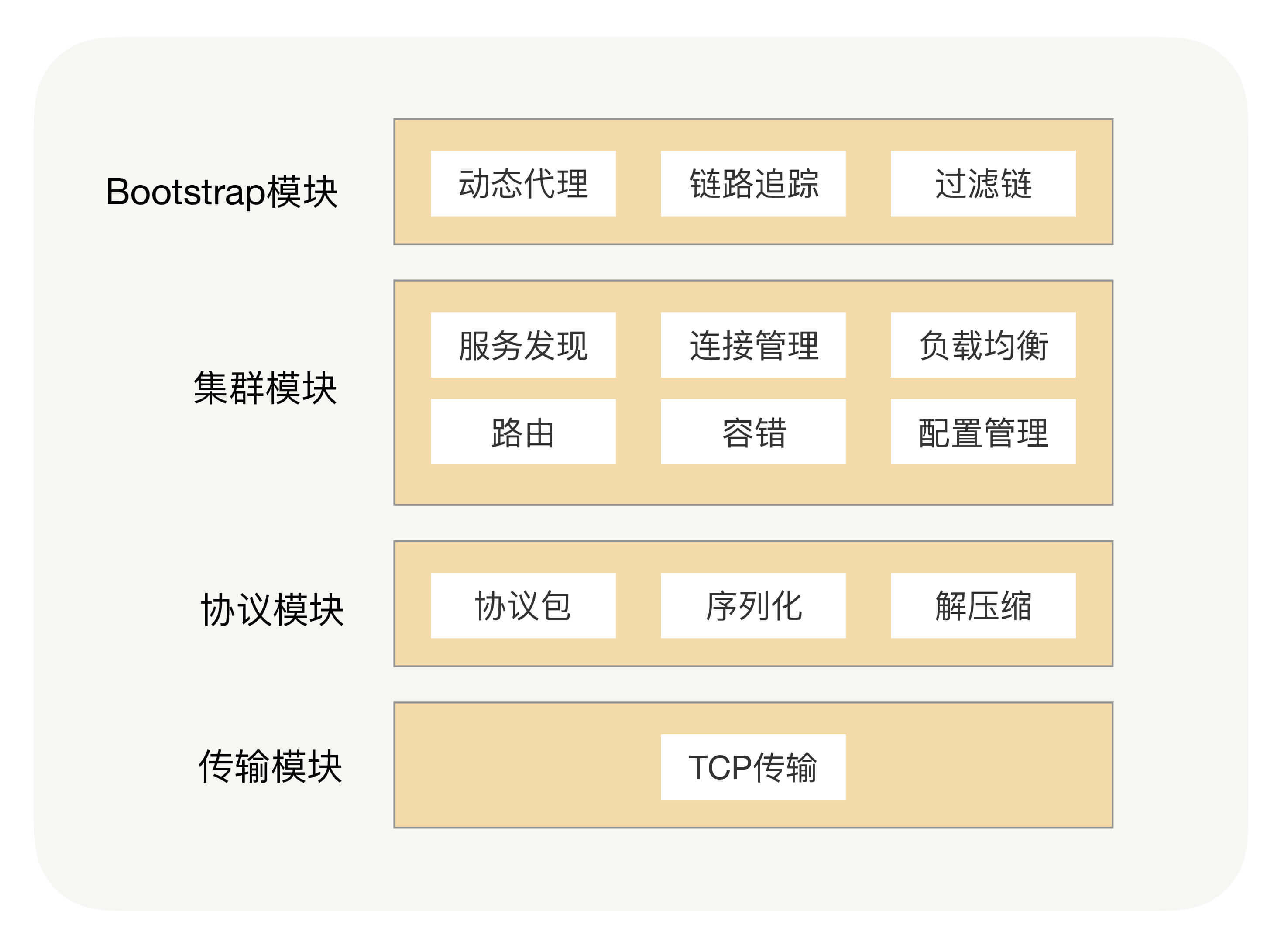 那到这儿,一个比较完善的RPC框架基本就完成了,功能也差不多就是这些了。按照分层设计的原则,我将这些功能模块分为了四层,具体内容见图示: