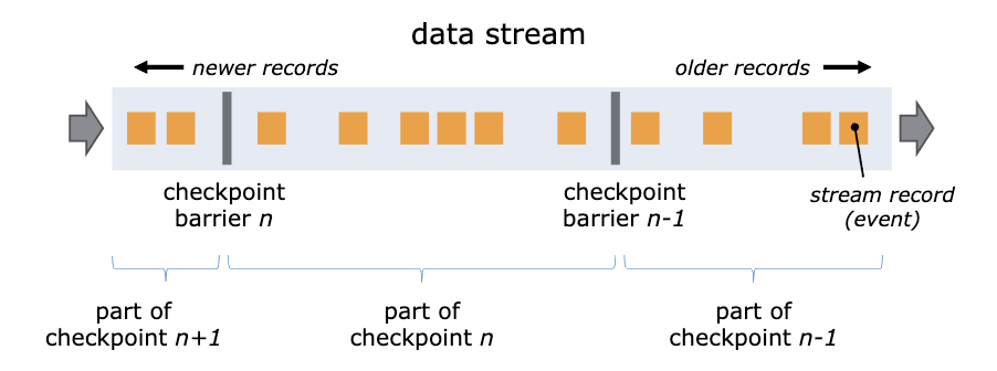 Flink通过在数据流中插入一个Barrier(屏障)来确保CheckPoint中的位置和状态完全对应。下面这张图来自Flink官网的说明文档。