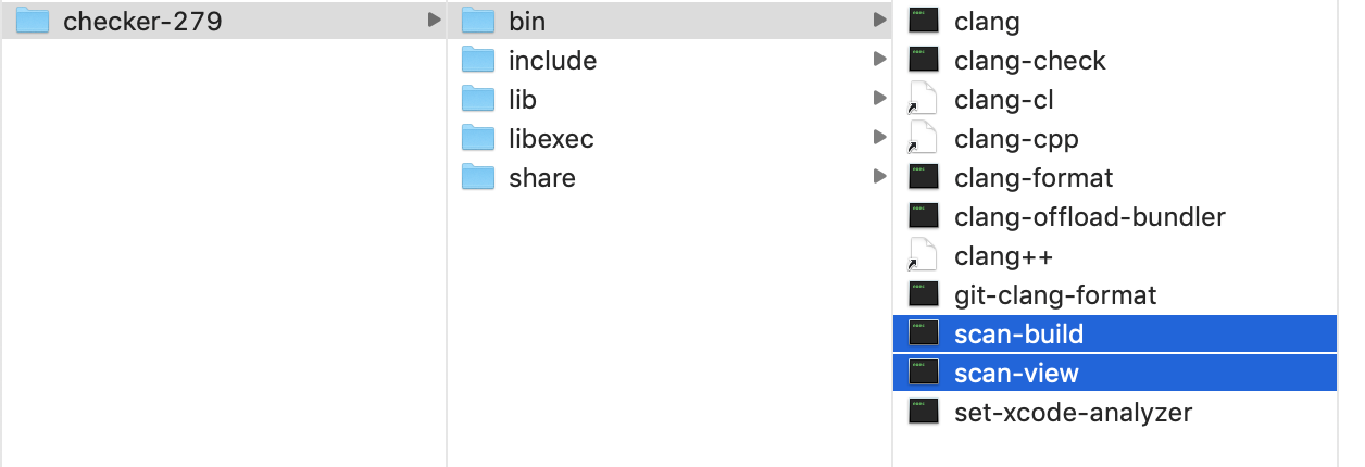 scan-build 是用来运行分析器的命令行工具;scan-view 包含了 scan-build 工具,会在 scan-build 执行完后将结果可视化。