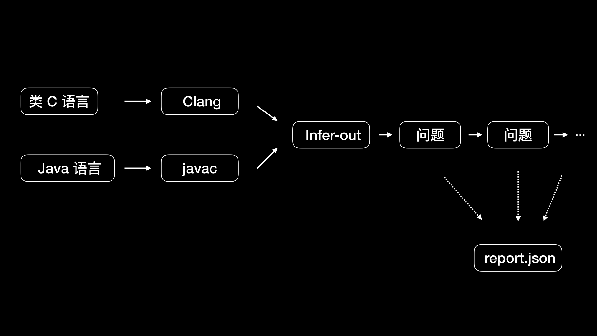 - 第一个阶段是转化阶段,将源代码转成 Infer 内部的中间语言。类 C语言使用 Clang 进行编译,Java语言使用 javac 进行编译,编译的同时转成中间语言,输出到 infer-out 目录。