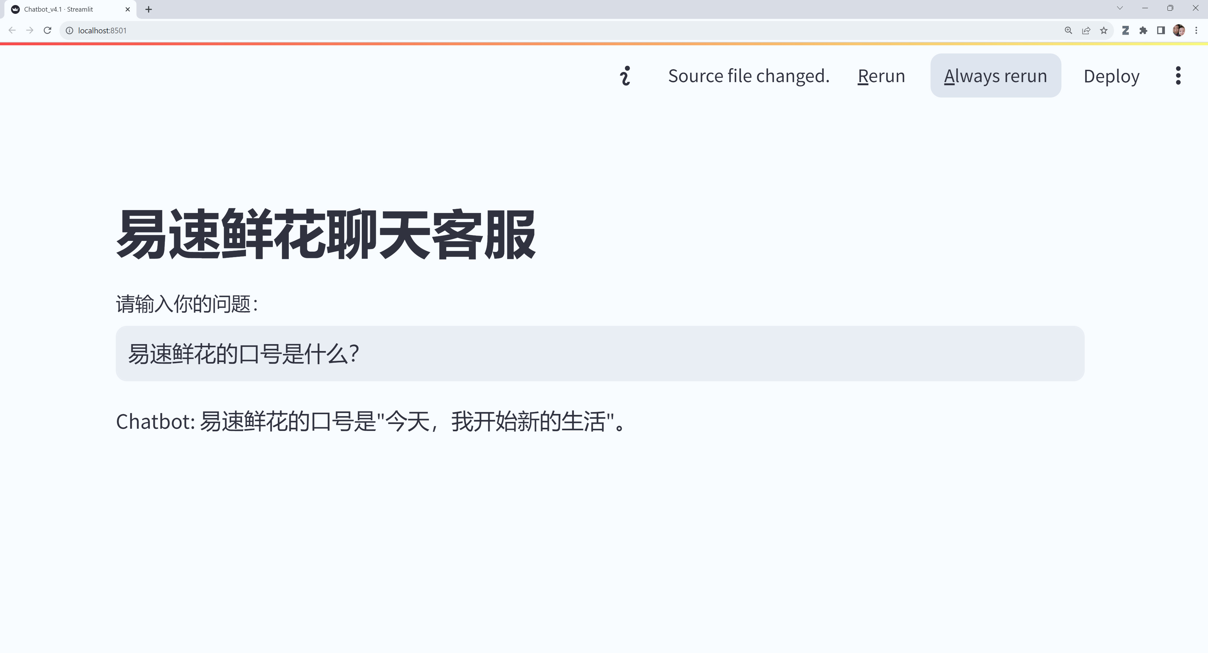 界面创建: a. st.title("易速鲜花聊天客服"):设置 Web 应用程序的标题为“易速鲜花聊天客服”。 会话状态: a. 使用 st.session_state 来存储用户会话状态。这是 Streamlit 的一个特性,允许你在用户与应用程序交互时保存变量。 b. if "bot" not in st.session_state:检查是否已经有一个 bot 实例存在于 session state 中。如果没有,就创建一个新的 ChatbotWithRetrieval 实例,并将其保存到 session state。这样做的好处是可以避免在每次用户与应用程序交互时重新初始化机器人。 用户交互: a. user_input = st.text_input("请输入你的问题:"):创建一个文本输入框供用户输入问题。当用户输入内容并提交后,代码会获取用户的输入,并使用聊天机器人的 qa 方法来获取响应。 b. st.write(f"Chatbot: {response['answer']}"):在应用程序界面上显示机器人的响应。 主函数中,当脚本被执行时,它将启动 Streamlit 服务器,并显示创建的 Web 应用程序。 用 streamlit run 运行程序,就可以开始聊天了!