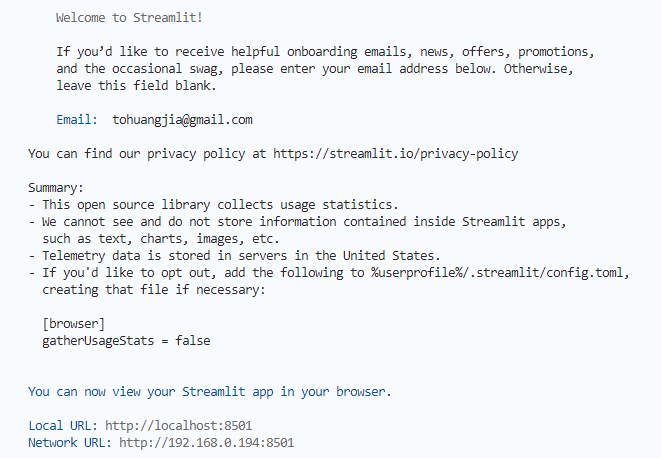 用 streamlit run <your_script_name>.py(注意,必须是streamlit run命令,而不是通过python命令来跑程序)来运行程序,就可以在浏览器中看到它。