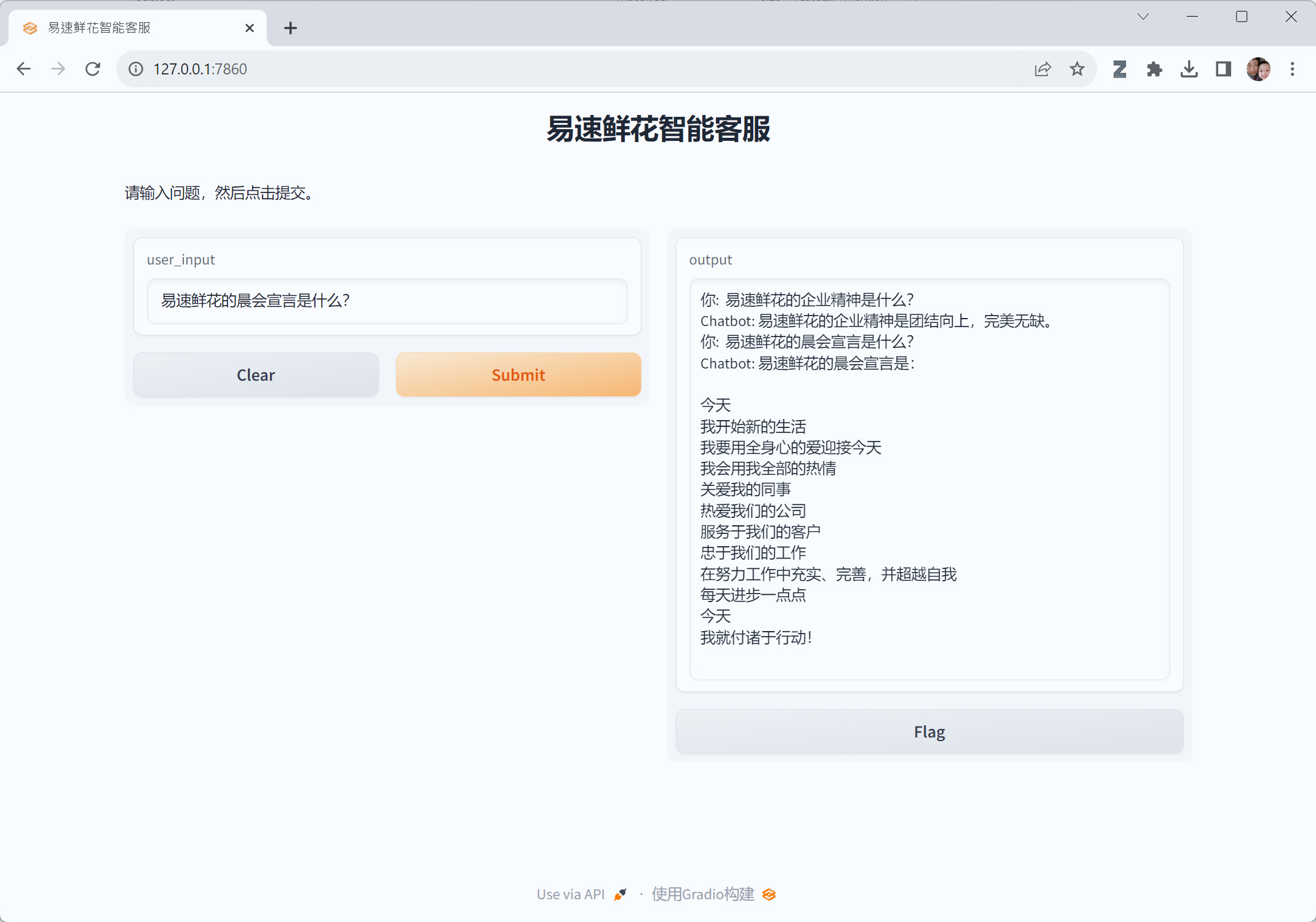 get_response(self, user_input):这个新函数是为 Gradio 创建的,它接收用户输入作为参数,并返回机器人的响应。为了保持聊天历史连续性,此函数将每次的用户输入和机器人的响应添加到 conversation_history,并返回整个聊天历史。使用 gr.Interface() 来定义 Gradio 界面。fn=bot.get_response:设置界面的主函数为刚刚创建的 get_response 函数。live=False:确保实时更新是关闭的,这意味着用户需要点击提交按钮来发送他们的问题,而不是一边打字,一边生成回答的流模式(比较适合展示生成式模型)。 启动 Gradio 界面。interface.launch():调用这个方法会启动 Gradio 的 Web 服务器,并在默认的 Web 浏览器中打开一个新窗口,显示刚刚定义的界面,用户可以通过这个界面与机器人交互。 运行程序,聊天机器人在本地端口 7860 上启动。