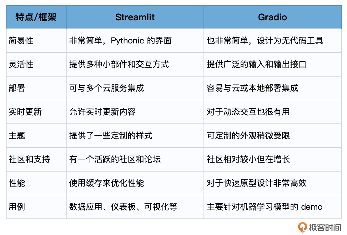 Streamlit 是为数据应用、仪表板和可视化设计的。它提供了多种小部件,使得用户可以与数据和模型进行交互。它非常 Pythonic,意味着它的使用方式非常自然,对于熟悉Python的人来说非常直观。 Gradio 更多是为了展示和演示机器学习模型。它提供了一种快速的方法,使非技术用户也能与机器学习模型进行交互,无需编写复杂的代码。 以下是对它们特点进行的对比总结。