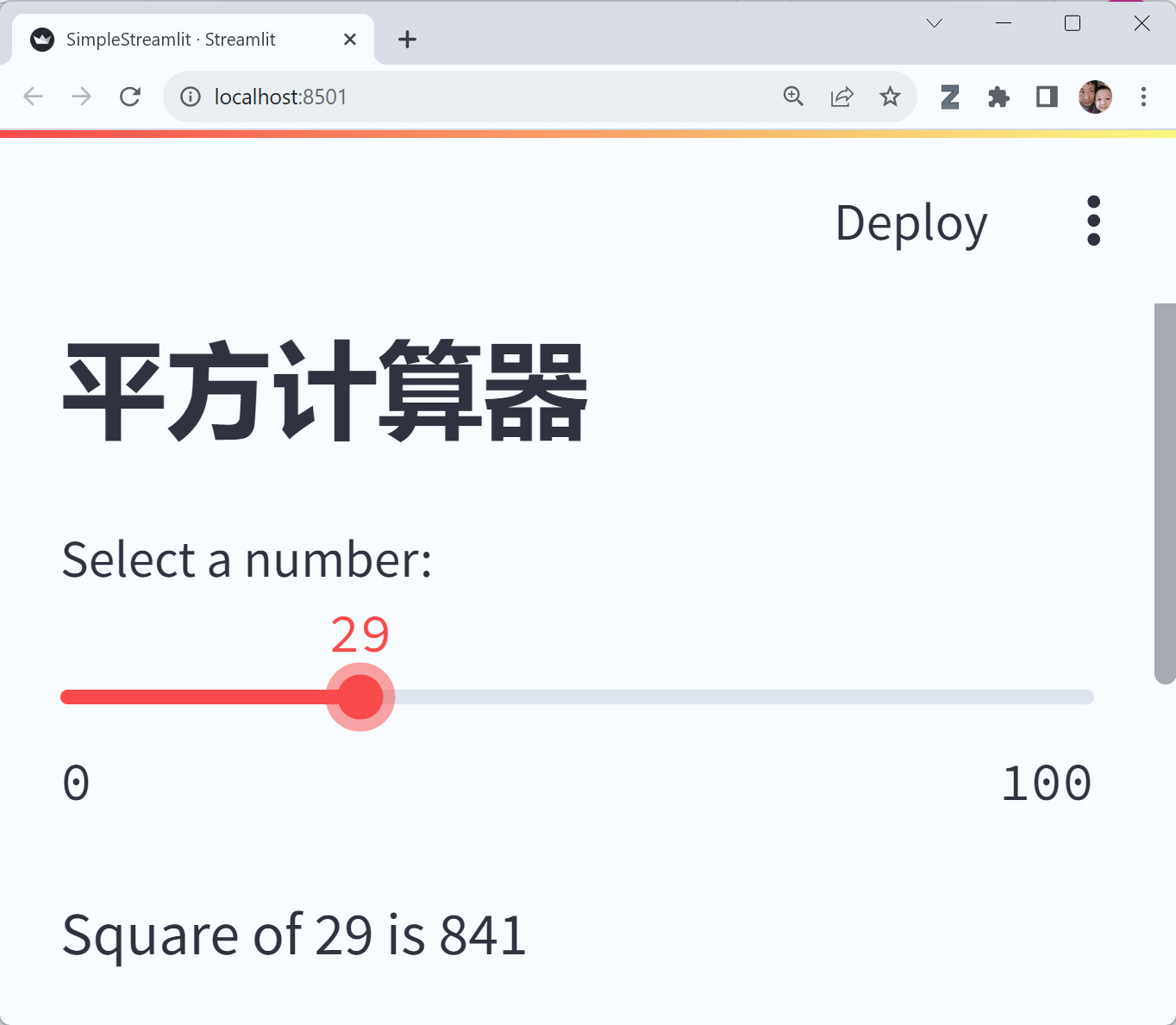 1 2 3 4 5 6 7 8 9 10 import streamlit as st # 设置标题 st.title('平方计算器') # 创建一个滑块 number = st.slider("Select a number:", min_value=0, max_value=100) # 显示选中数字的平方 st.write(f"Square of {number} is {number ** 2}")