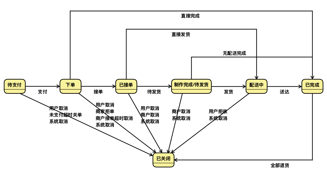 我们知道,无论订单的状态变化是如何的复杂,我们总是可以定义一个订单有哪些基本的状态,包括这些基本状态之间是如何变化的。比如,订单一开始都是用户下单后待支付,支付完成后变成一个有效的订单,然后由商家进行接单,制作完成后进行发货配送等等,订单最终的状态要么是完成,要么是取消。