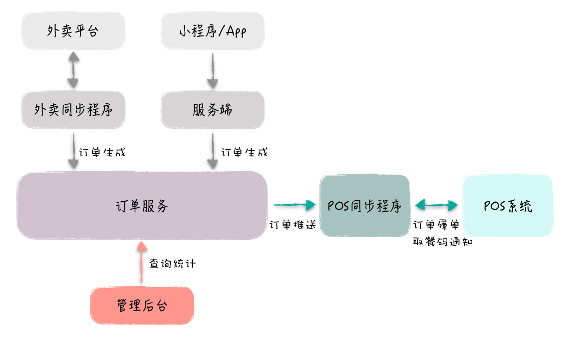 这是个O2O(Online To Offline,线上到线下)的交易业务,订单的来源有两个,一个是自有小程序或App过来的订单,还有一个是外卖平台过来的订单,然后这些线上的订单会同步到门店的收银系统进行接单和进一步处理。这里我放了一张订单的业务架构图,你可以到文稿中看下: