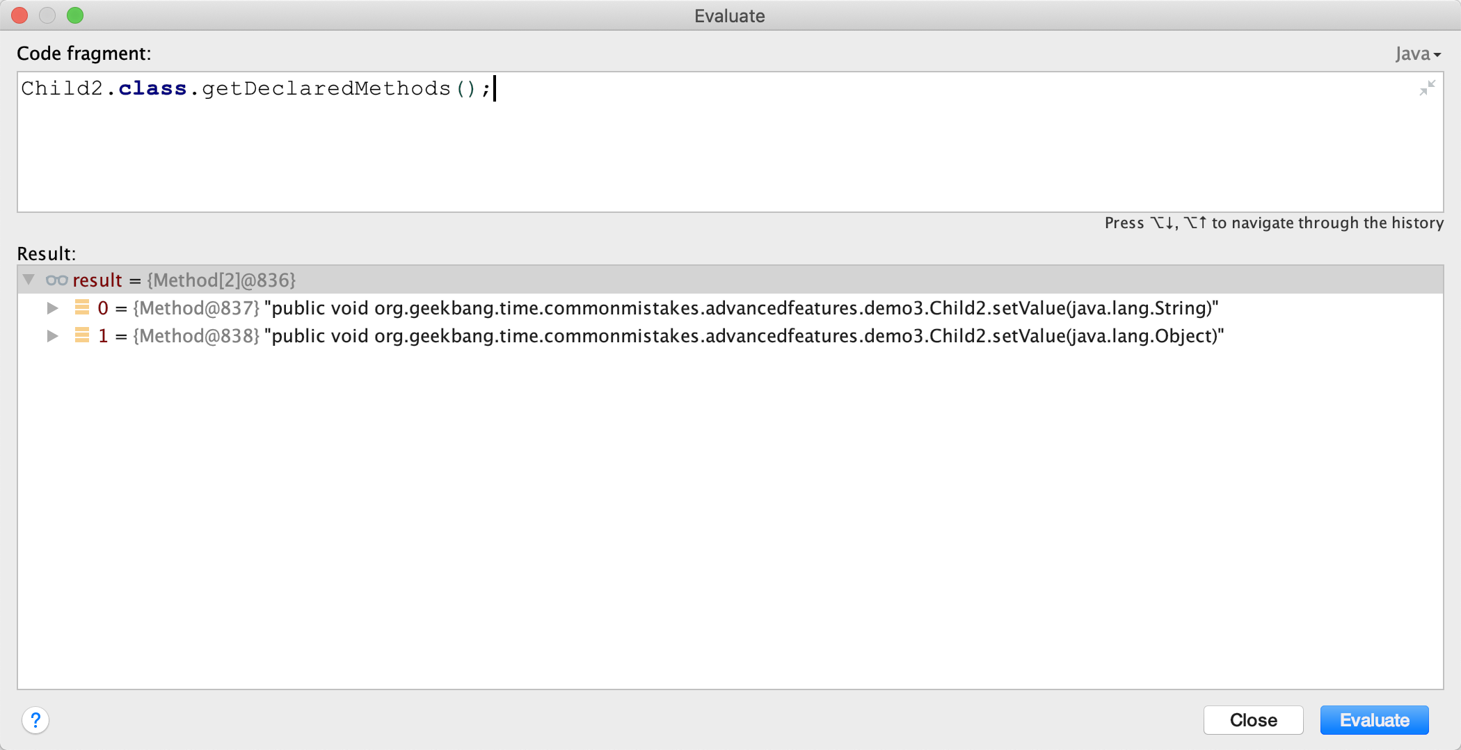 可以看到,这次是Child2类的setValue方法被调用了两次。开发同学惊讶地说,肯定是反射出Bug了,通过getDeclaredMethods查找到的方法一定是来自Child2类本身;而且,怎么看Child2类中也只有一个setValue方法,为什么还会重复呢?