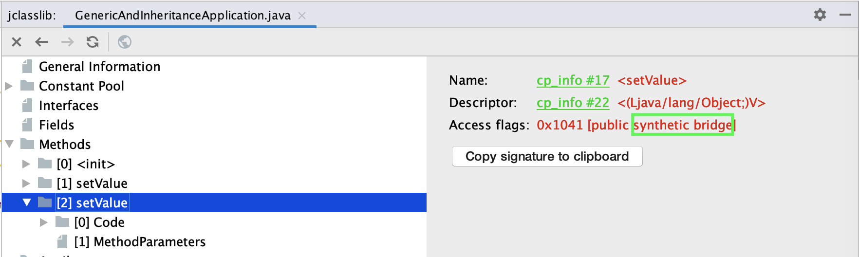 使用jclasslib工具打开Child2类,同样可以看到入参为Object的桥接方法上标记了public + synthetic + bridge三个属性。synthetic代表由编译器生成的不可见代码,bridge代表这是泛型类型擦除后生成的桥接代码: