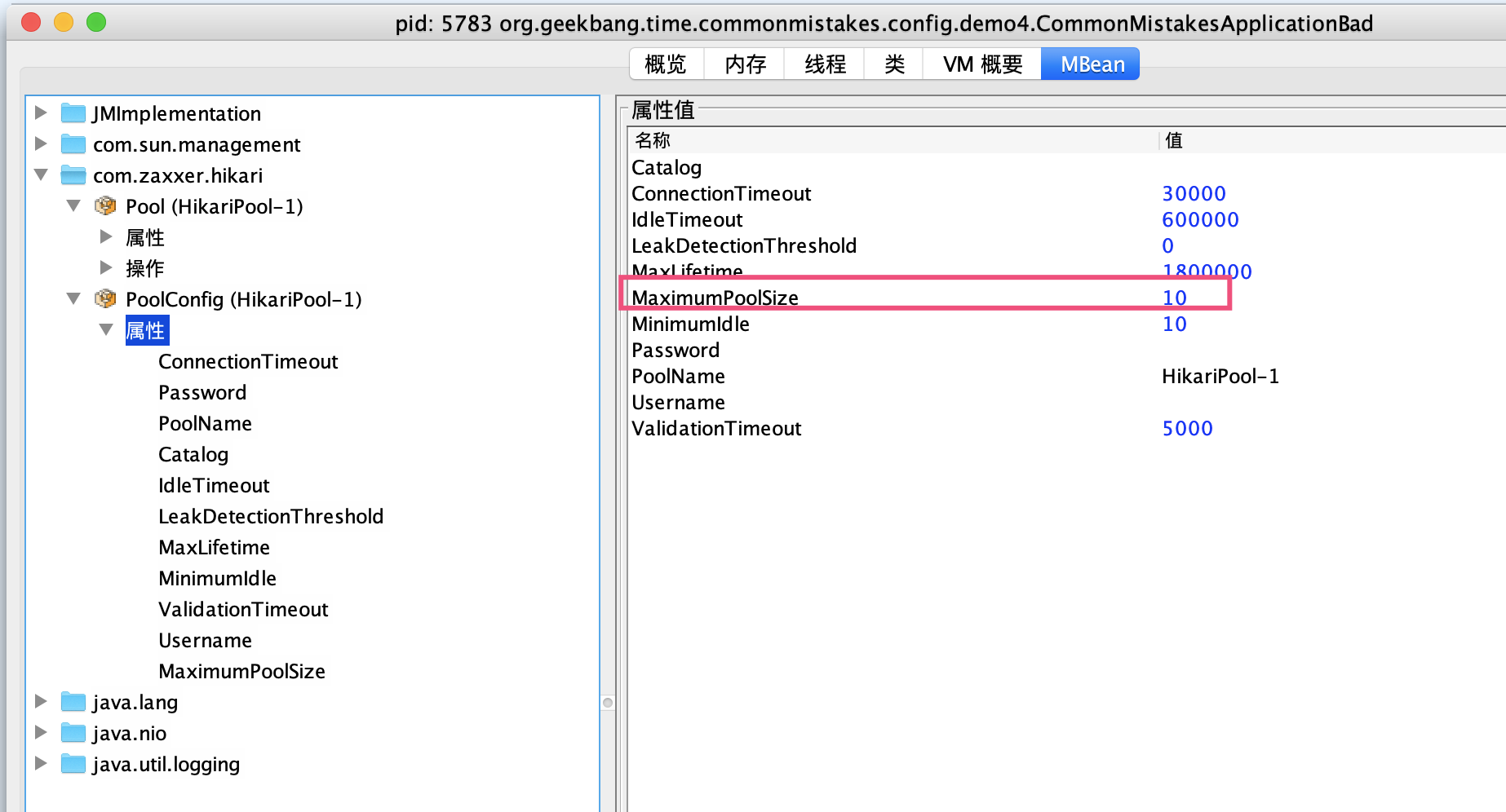 随后,修改配置文件启用register-mbeans,使Hikari连接池能通过JMX MBean注册连接池相关统计信息,方便观察连接池: