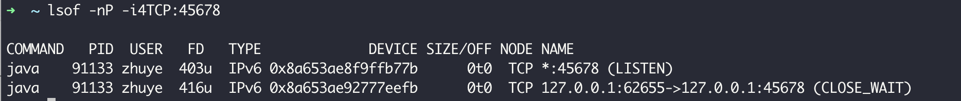 对这个接口进行几秒的压测(压测使用wrk,1个并发1个连接)可以看到,已经建立了三千多个TCP连接到45678端口(其中有1个是压测客户端到Tomcat的连接,大部分都是HttpClient到Tomcat的连接):