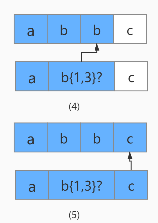 接着继续使用b{1,3} 和字符串的第四个字符c进行比较,发现不匹配了,此时就会发生回溯,已经读取的字符串第四个字符c将被吐出去,指针回到第三个字符b的位置。
