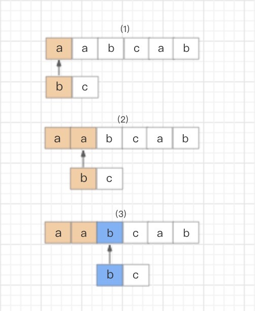 首先,读取正则表达式的第一个匹配符和字符串的第一个字符进行比较,b对a,不匹配;继续换字符串的下一个字符,也是a,不匹配;继续换下一个,是b,匹配。