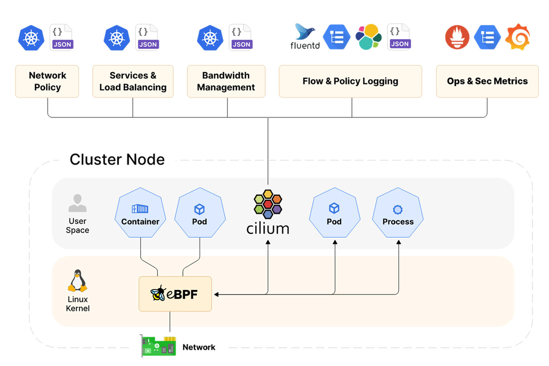 而Cilium则是基于eBPF,直接把这些逻辑动态的扩展到了内核中,所以性能会远高于传统的方法,你可以对照下面的架构图看一看。