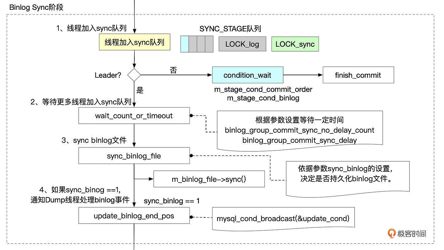 - 如果设置了参数binlog_group_commit_sync_delay和binlog_group_commit_sync_no_delay_count,等待一定的时间,让更多的线程加入到group中。