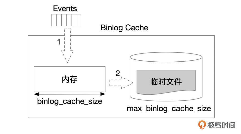 用户线程执行过程中生成的Binlog事件会先缓存到Binlog Cache。Binlog Cache内部分配了一块内存空间,大小由参数binlog_cache_size控制。Binlog事件先写入到内存空间中,如果事务生成的Binlog超过了binlog_cache_size,就会将数据写到临时文件中。临时文件的大小由参数max_binlog_cache_size控制。如果事务生成的Binlog超过了参数max_binlog_cache_size的限制,事务会失败。