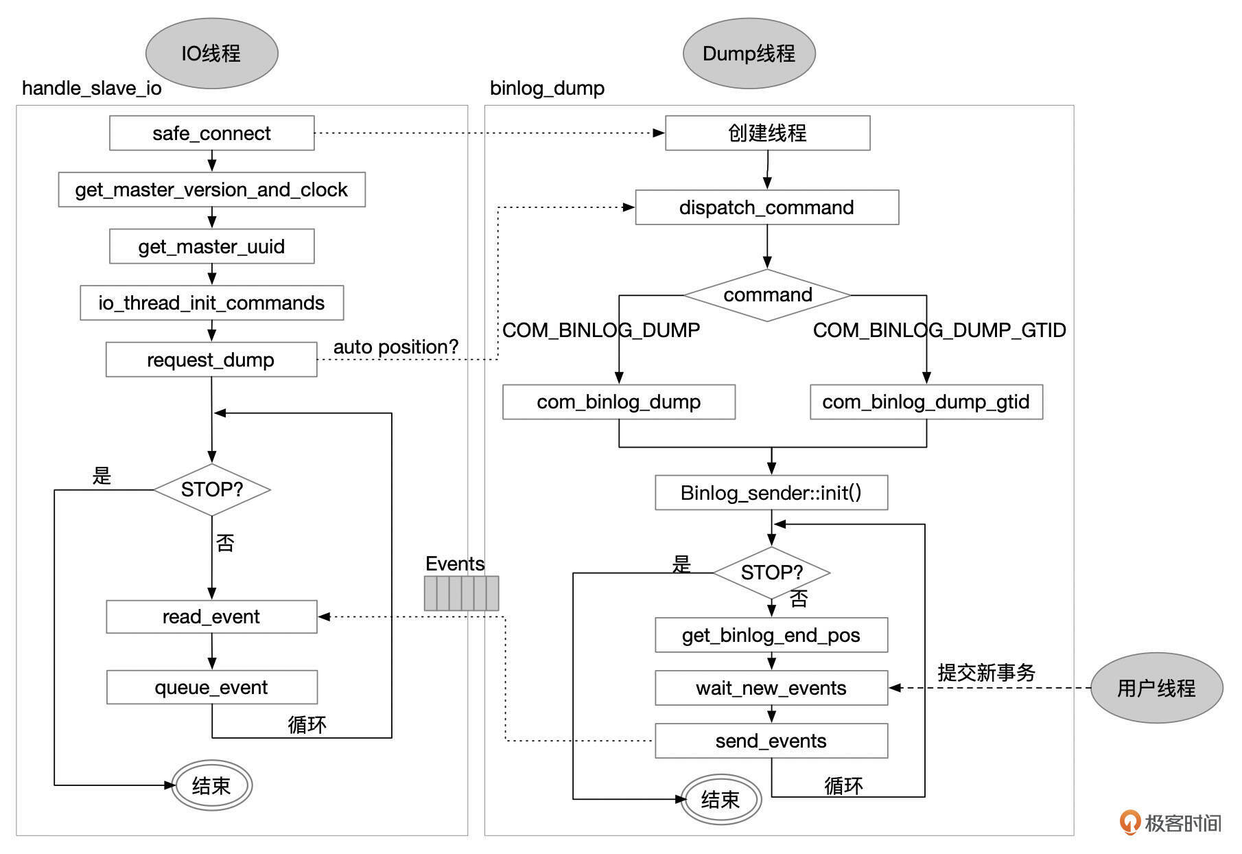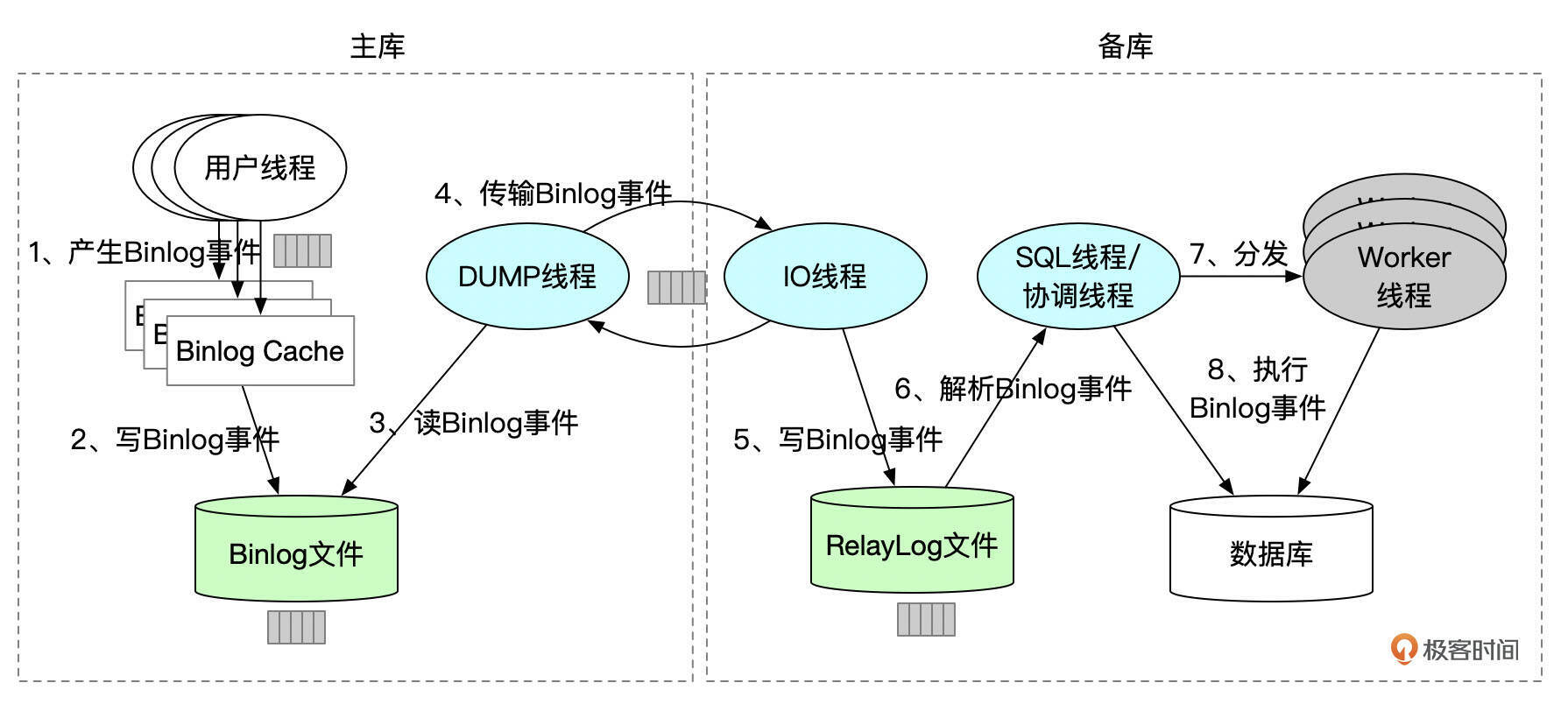 最后,我们来看一下Binlog是怎么从主库同步到备库的。同步操作由主库的Dump线程和备库的IO线程一起配合完成。