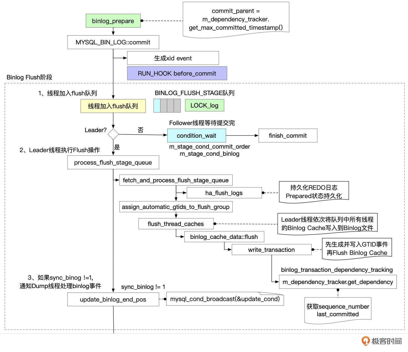 - 提交事务的线程进入Flush队列。第一个进入队列的线程成为Leader往下执行。其他线程成为follower,等待Leader提交完成后再进行后续处理。