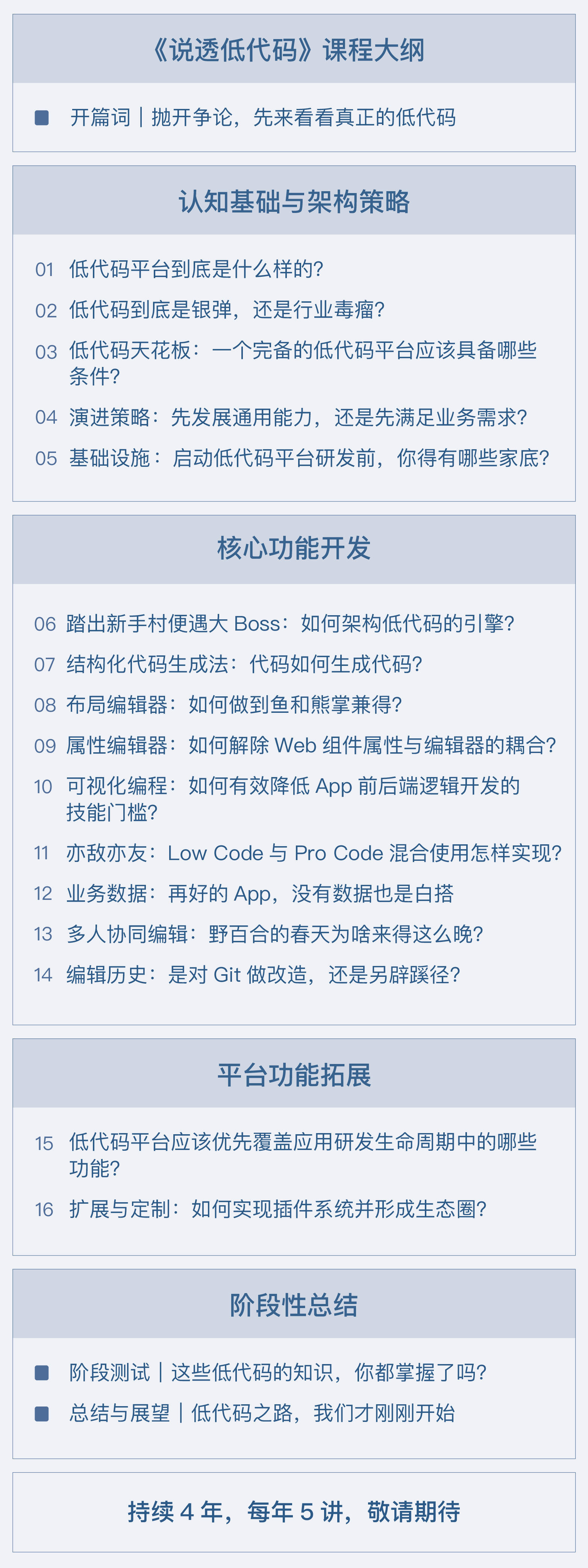 到这里你可能会发现,似乎这三部分并不是这个专栏的全部。确实,这是动态更新的专栏,第一阶段更新完后的四年之内,我会以每年5讲的频率,继续更新,带你去看最新、最前沿的低代码技术动态。内容主要有这些方面: