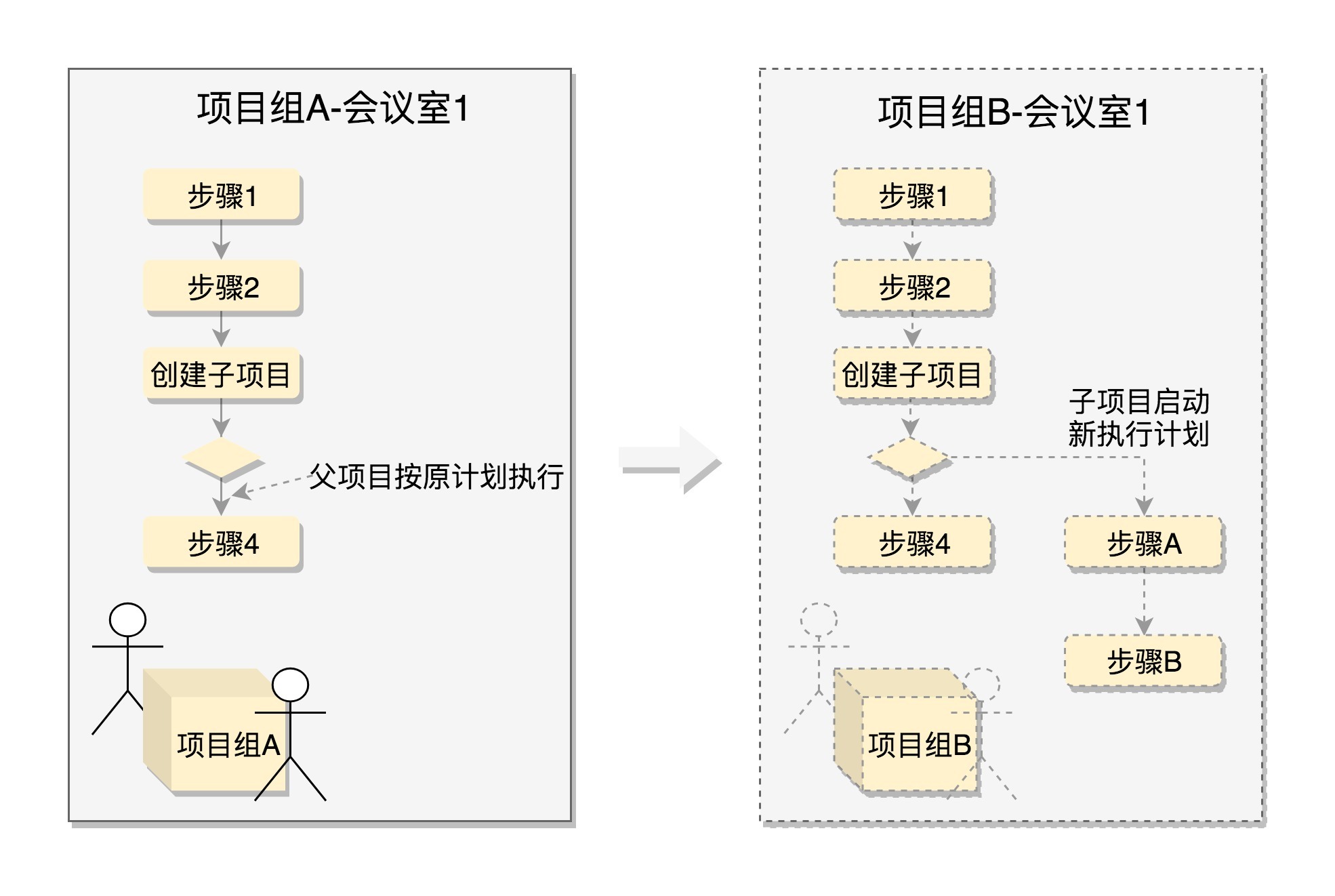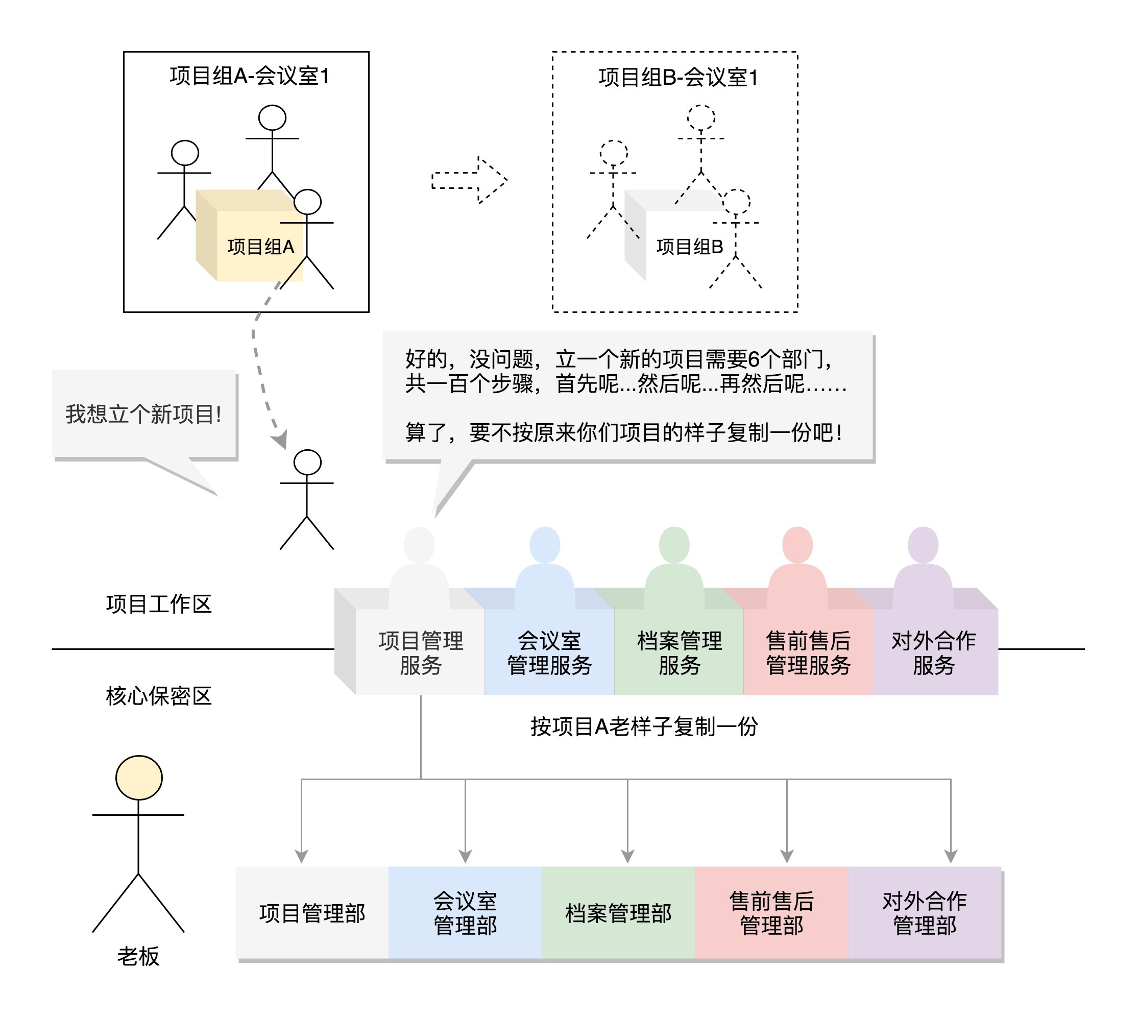 一个项目的执行是很复杂的,需要涉及公司各个部门的工作,比如说,项目管理部门需要给这个项目组开好Jira和Wiki,会议室管理部要为这个项目分配会议室等等。