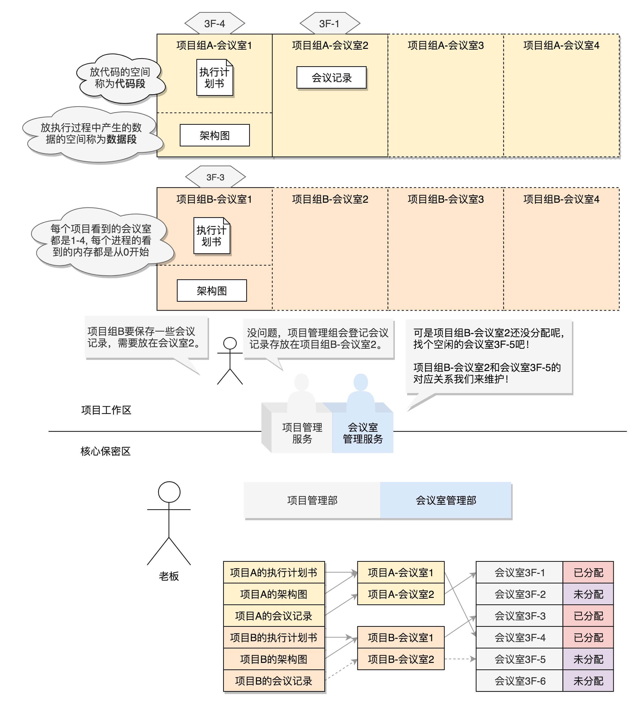 一个进程的内存空间是很大的,32位的是4G,64位的就更大了,我们不可能有这么多物理内存。就像一个公司的会议室是有限的,作为老板,你不可能事先都给项目组分配好。哪有这么多会议室啊,一定是需要的时候再分配。