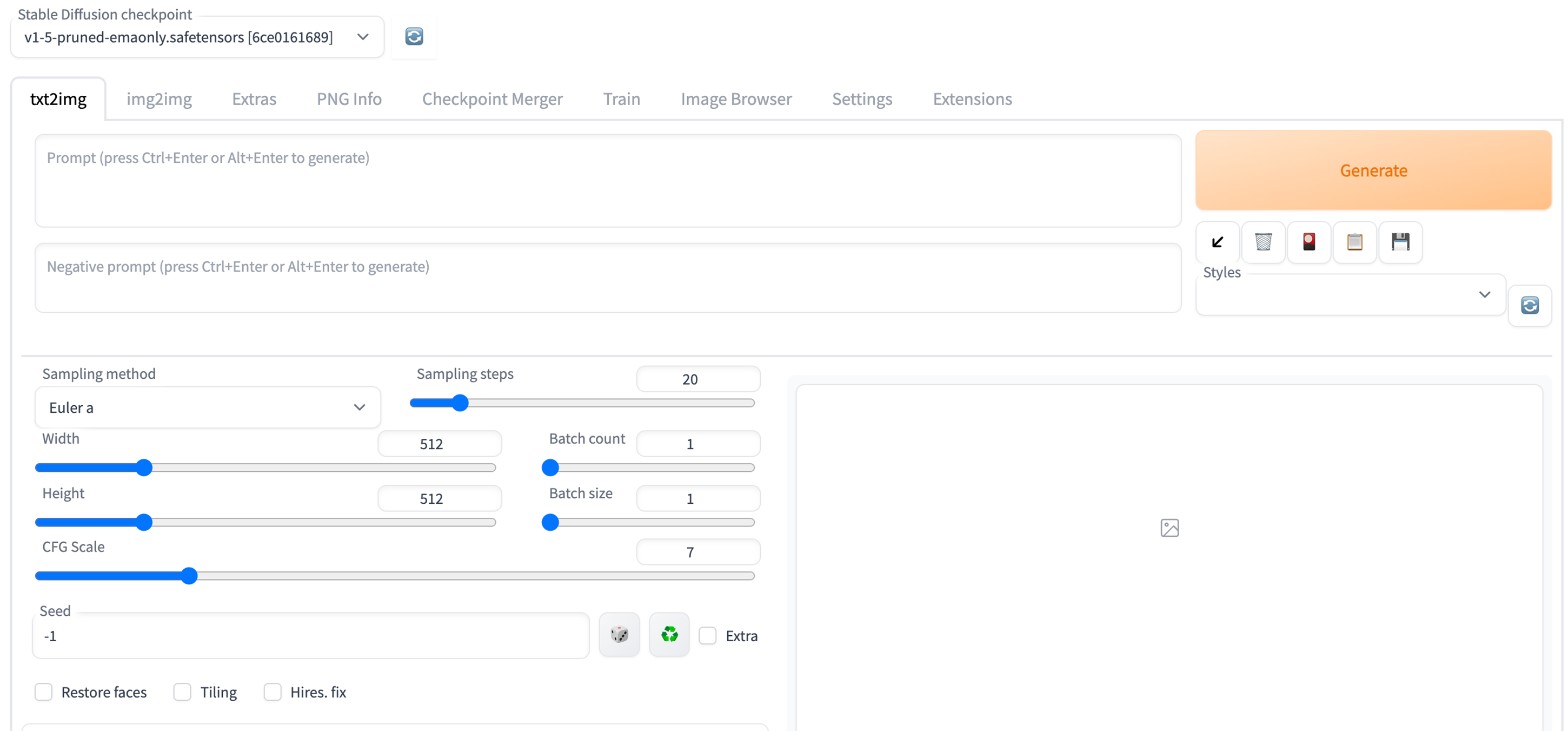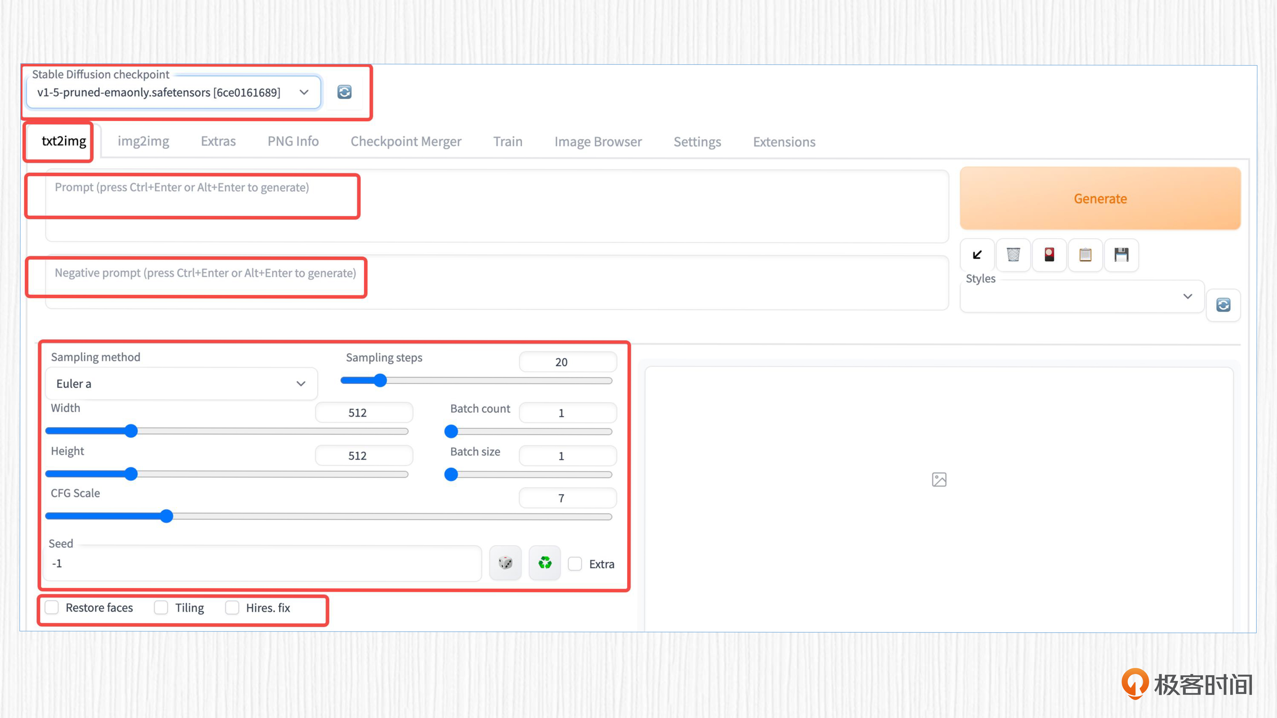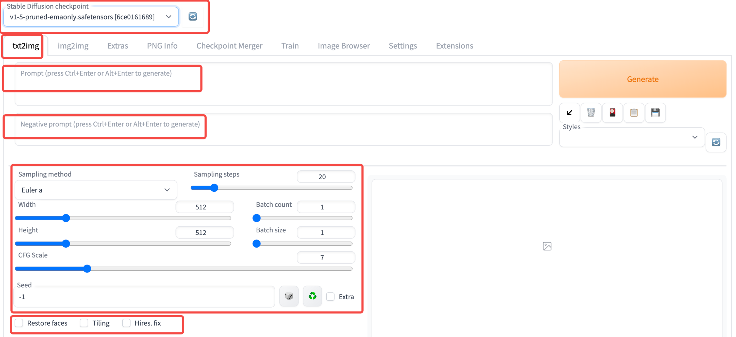 - prompt:用于生成图像的文字输入,需要使用英文输入,但你也可以通过探索Extensions来实现中文输入。